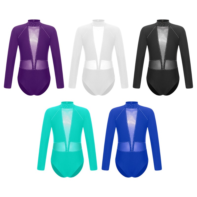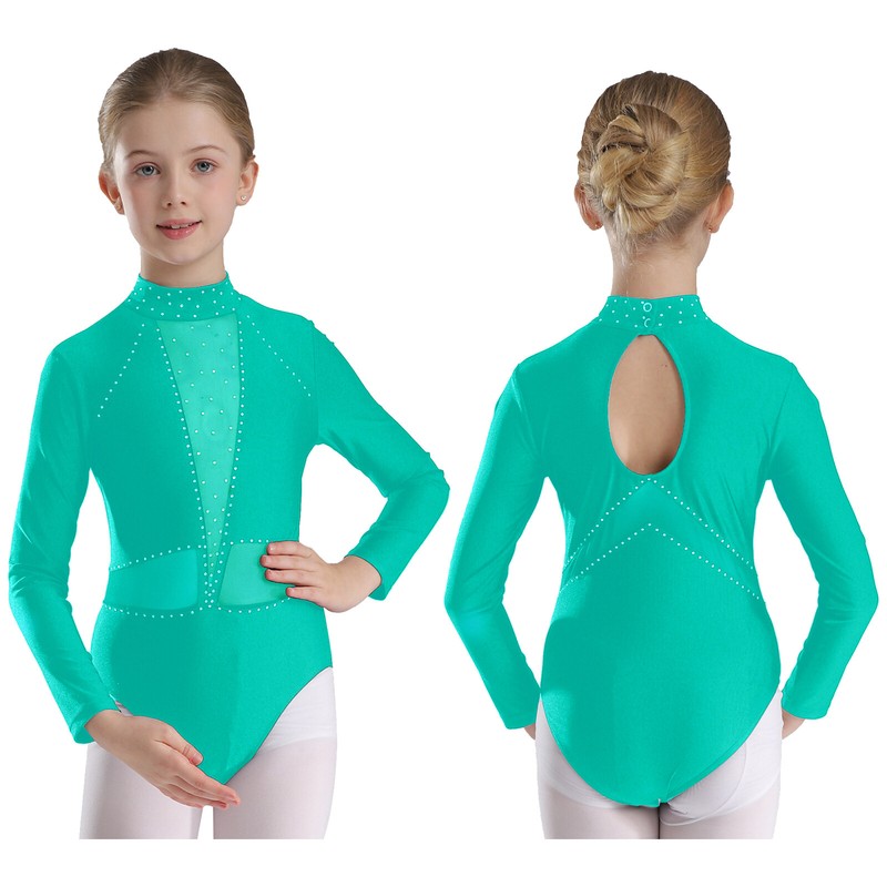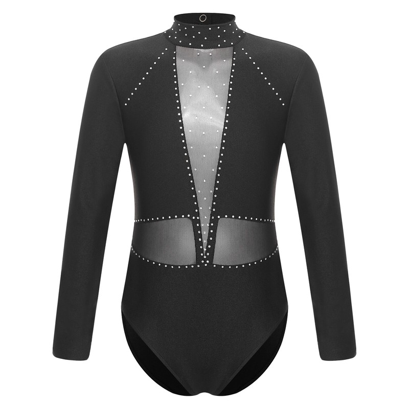This figure skating leotard with sheer mesh patchwork design and rhinestones makes your child stand out from the crowd.