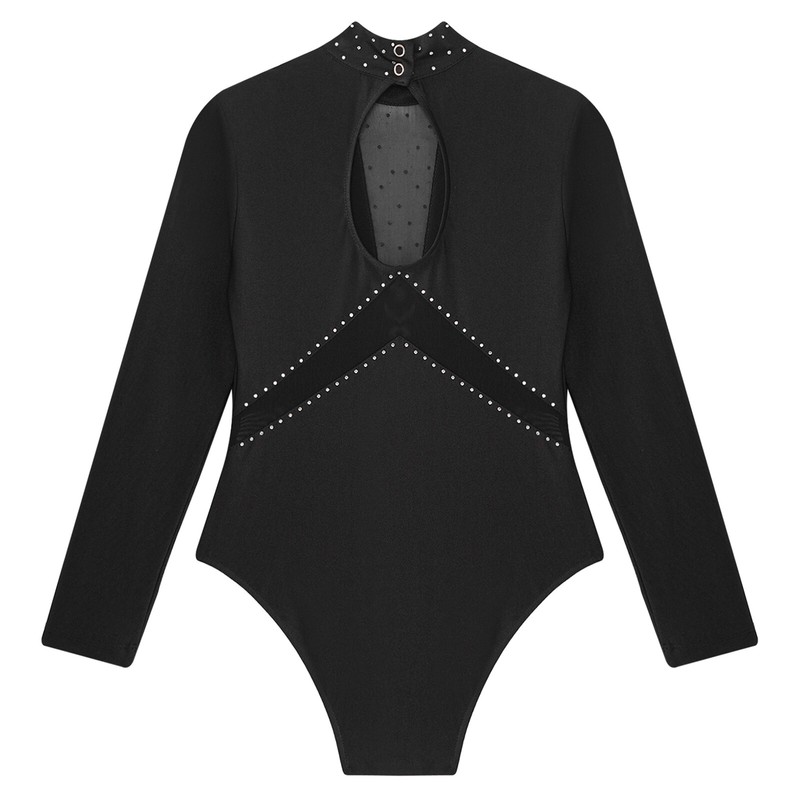 Long sleeve leotard for girls, keyhole back, mock neck with press buttons for easy wearing and taking off.