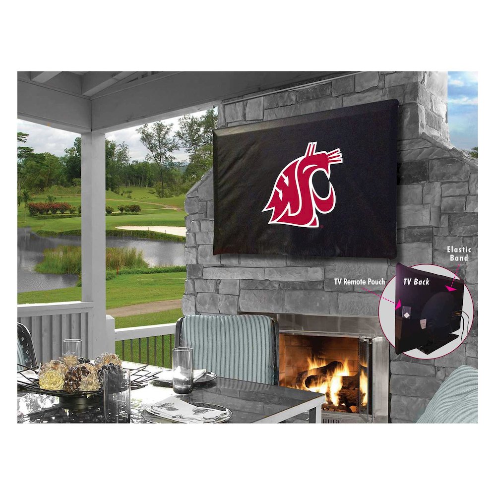 This Washington State TV Cover by HBS is hand-made in the USA using the finest commercial grade vinyl and utilizing a step-by-step screen print process to give you the most detailed logo possible. UV resistant inks are used to ensure exceptional durability to direct sun exposure. Spandex-like material wraps around the back of the TV, keeping moisture out while allowing heat out and helping to prevent overheating. Back opening allows a fit on any wall mount, and bungee allows cover to be cinched down securely. Cover also contains a pocket for remote control storage. This product is Officially Licensed, so you can show your pride while protecting your TV from the elements of nature. Keep your TV protected and support your team with the help of Covers by HBS! Fits TV sizes 50" to 56".