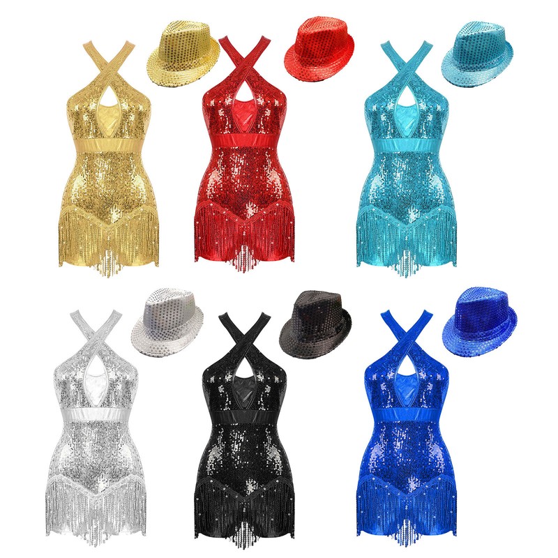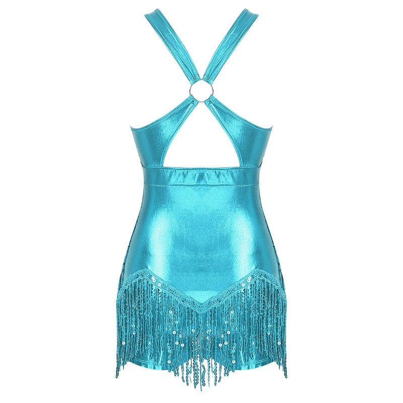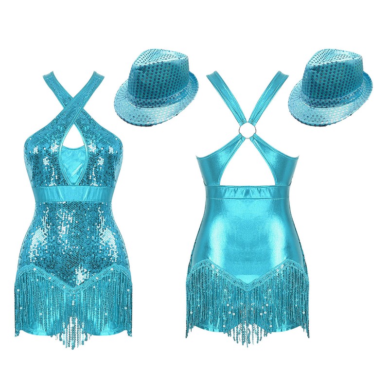 Fringed dance leotard sways gently with the step and adds a sense of movement to show the beauty of dance. Pair with a sequins hat.