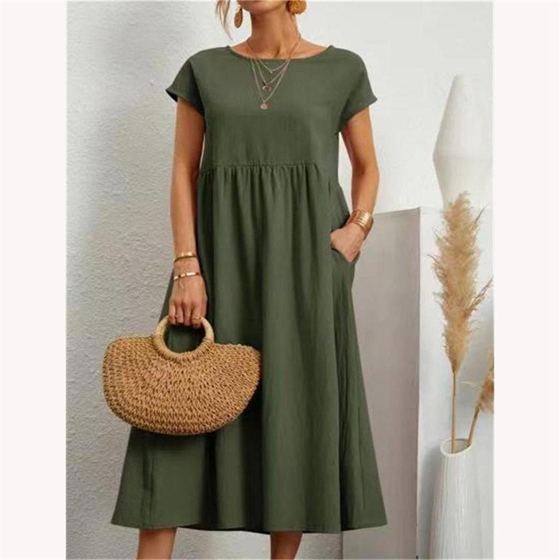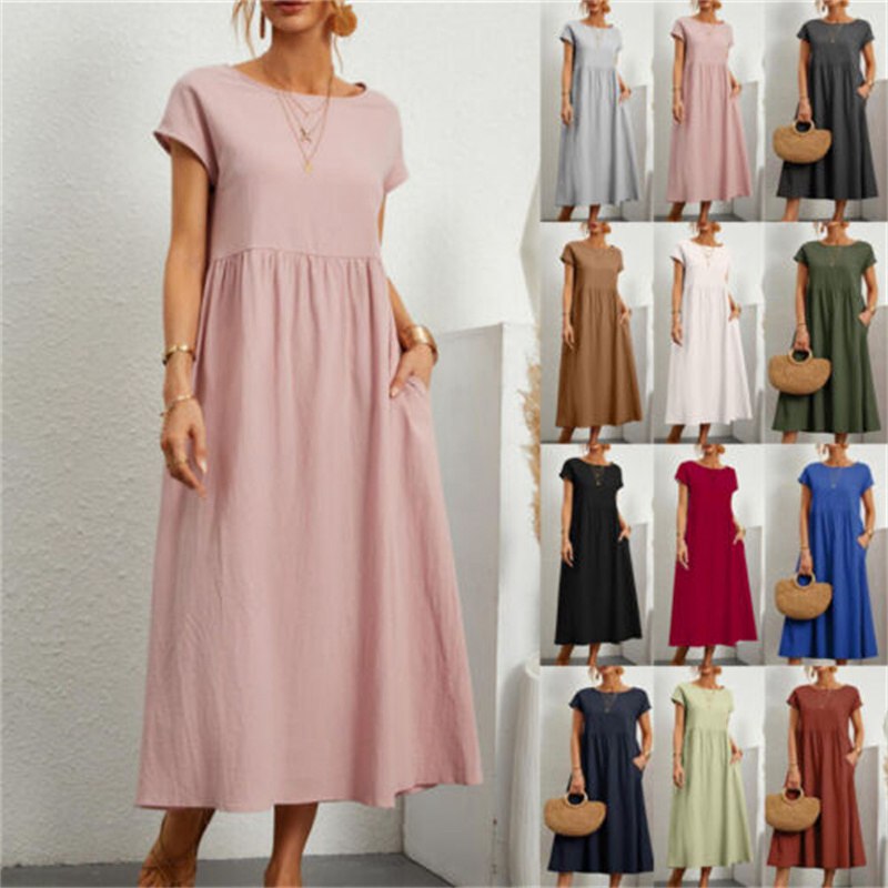 Ladies Summer Casual Cotton Linen Midi Dress Womens Holiday Plain Pleated Swing