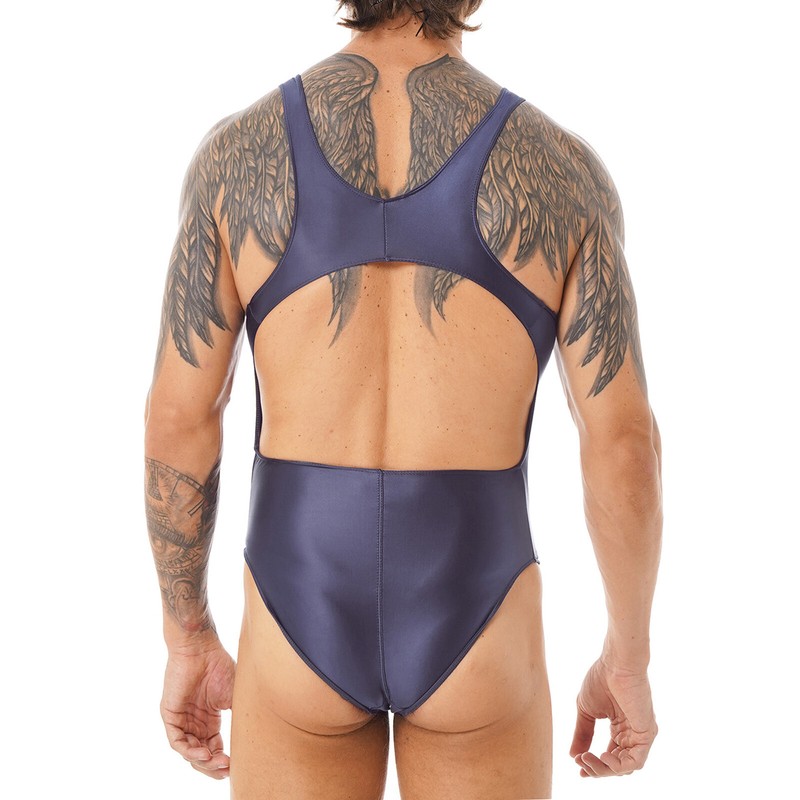 Mens Solid Color Glossy One-piece Swimsuit Cutout Back Bodysuit Leotard Swimwear.