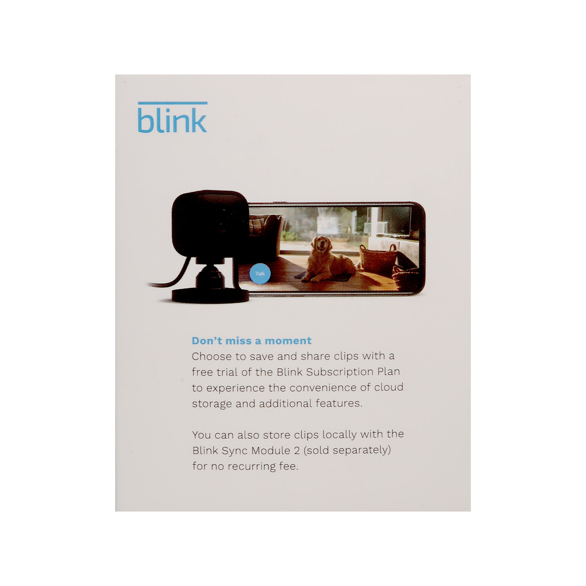 • Choose to save and share clips with a free 30-day trial of the Blink Subscription Plan or locally with the Sync Module 2 (sold separately).