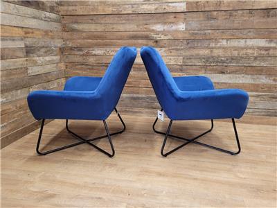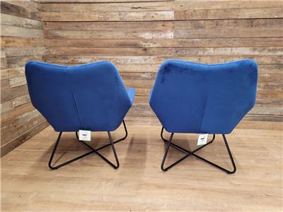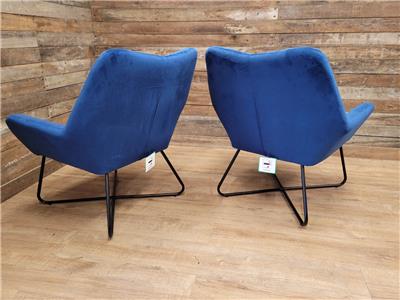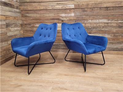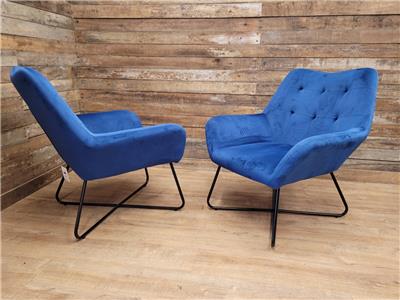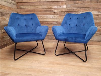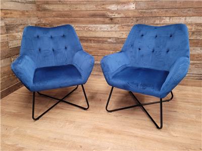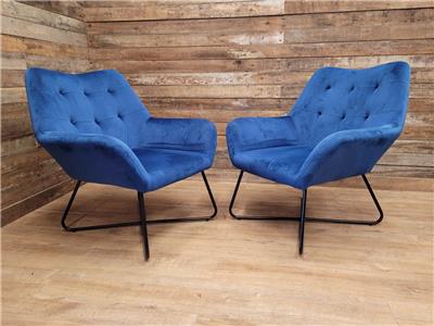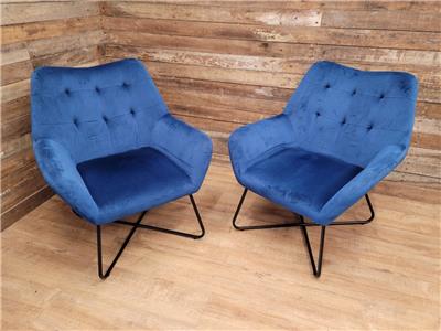 A super comfortable pair of rich blue velvet button backed armchairs, great for a living room or bedroom, fabulous retro styling make for very comfortable chairs.