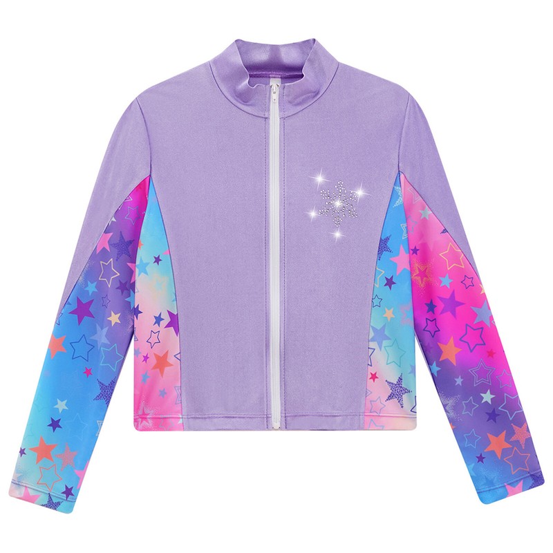 Stand collar sweatshirt for girls, stylish printed patchwork design, front zipper closure for easy wearing.