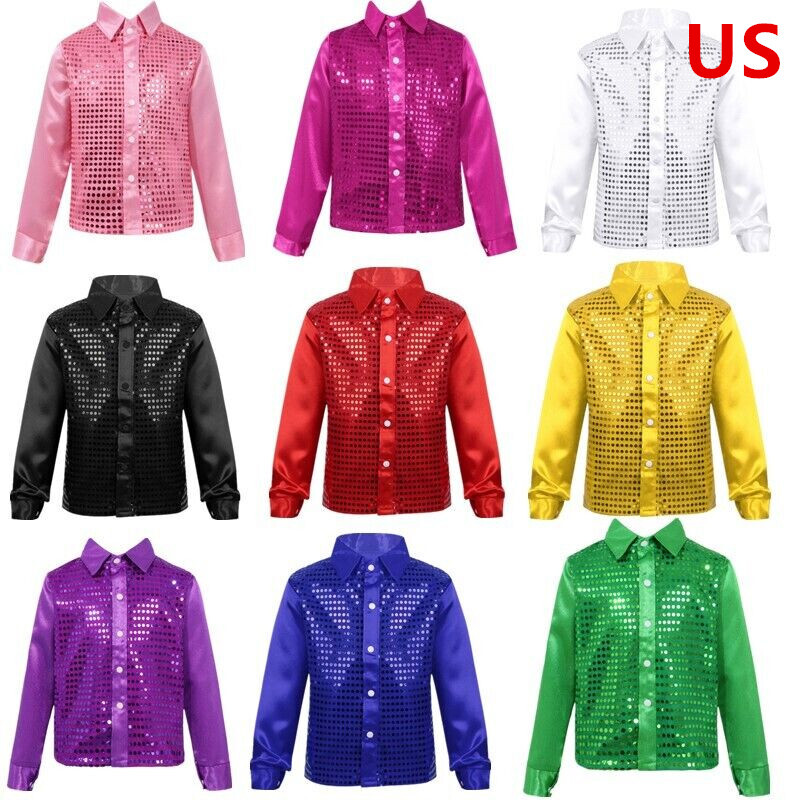 US Kids Boys Quick Dry Short Sleeve T-shirt Metallic Shiny Tops Stage Costume