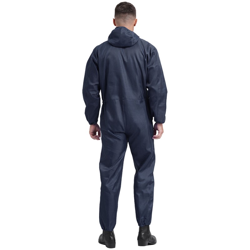Men’s work overall designs with drawstring hood, long sleeves, front half zipper, long pants and big pockets, one-piece coverall.