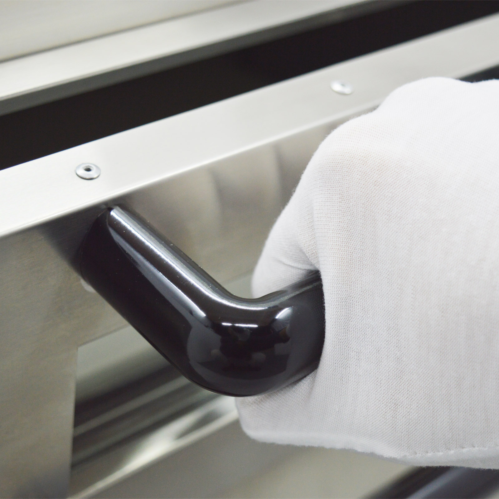 The left and right sides of the oven are designed with a large number of heat emission holes to expel excess heat generated by the machine, there by protecting the machine. | The upper and lower sides of the oven are designed with heat insulation handles, made of high- quality plastic, with good anti-hot and insulation effect, comfortable to hold. |