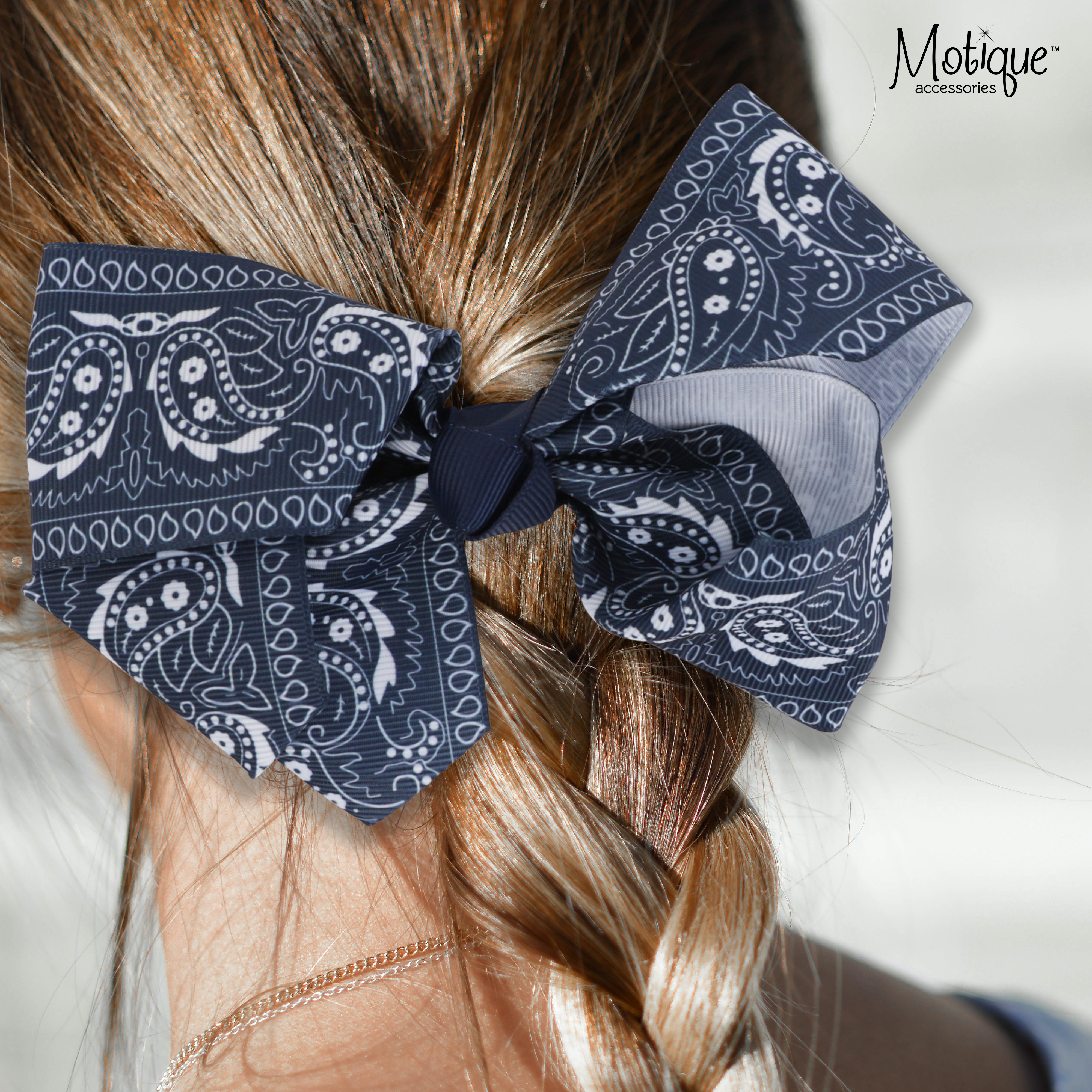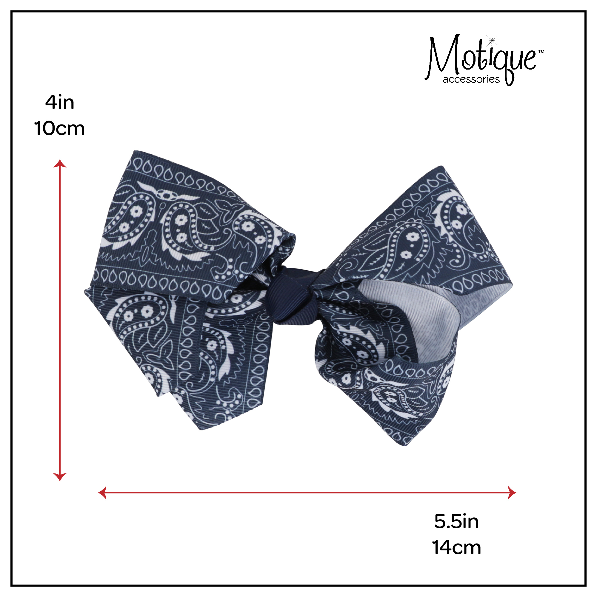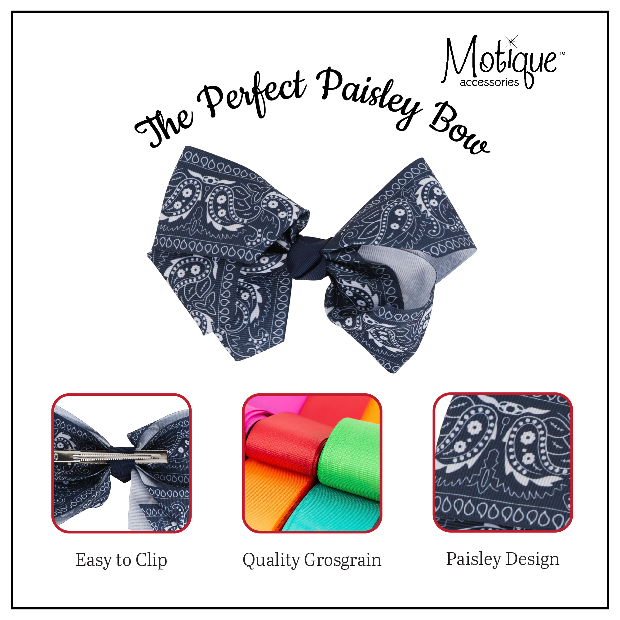 This is a pack of 4 matching paisley printed hair bows add fun flair to any outfit. Measuring 5.5 inches wide by 4 inches high, the large size makes a bold statement without overpowering. Made of durable grosgrain ribbon with a vivid paisley print, each bow is attached to a strong metal clip to securely fasten to hair without slipping. The printed design adds pattern without extra bulk, letting personality shine through without weighing hair down. Whether worn daily or for special occasions, these bows are a playful way to accessorize any ensemble with their eye-catching style. Their large size works for both short and long hair alike.