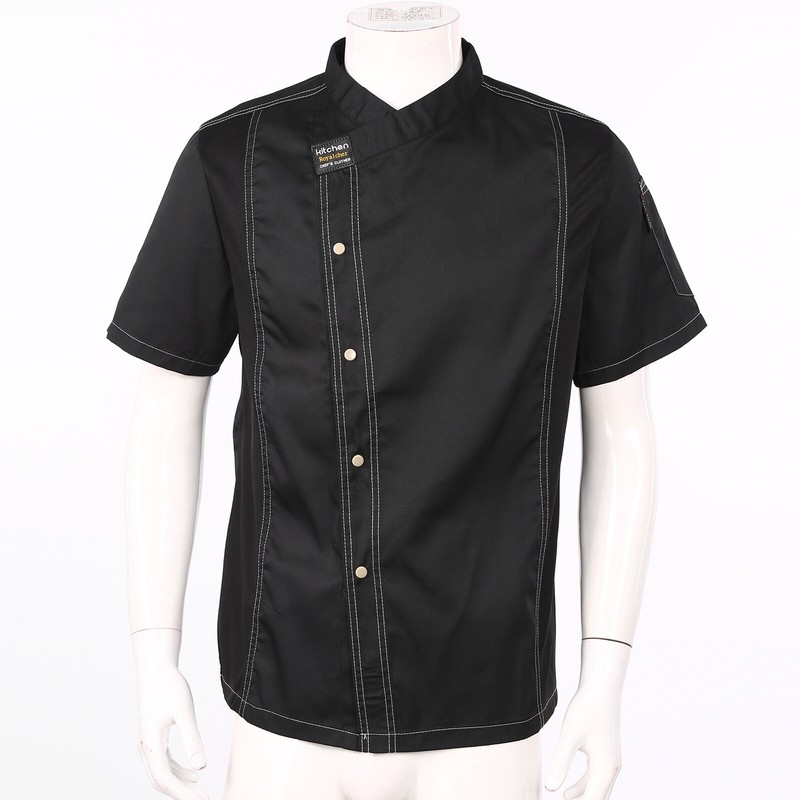 Solid color short sleeve chef coat for men and women, crossover collar, regular fit, press button closure, convenient to put on and take off.