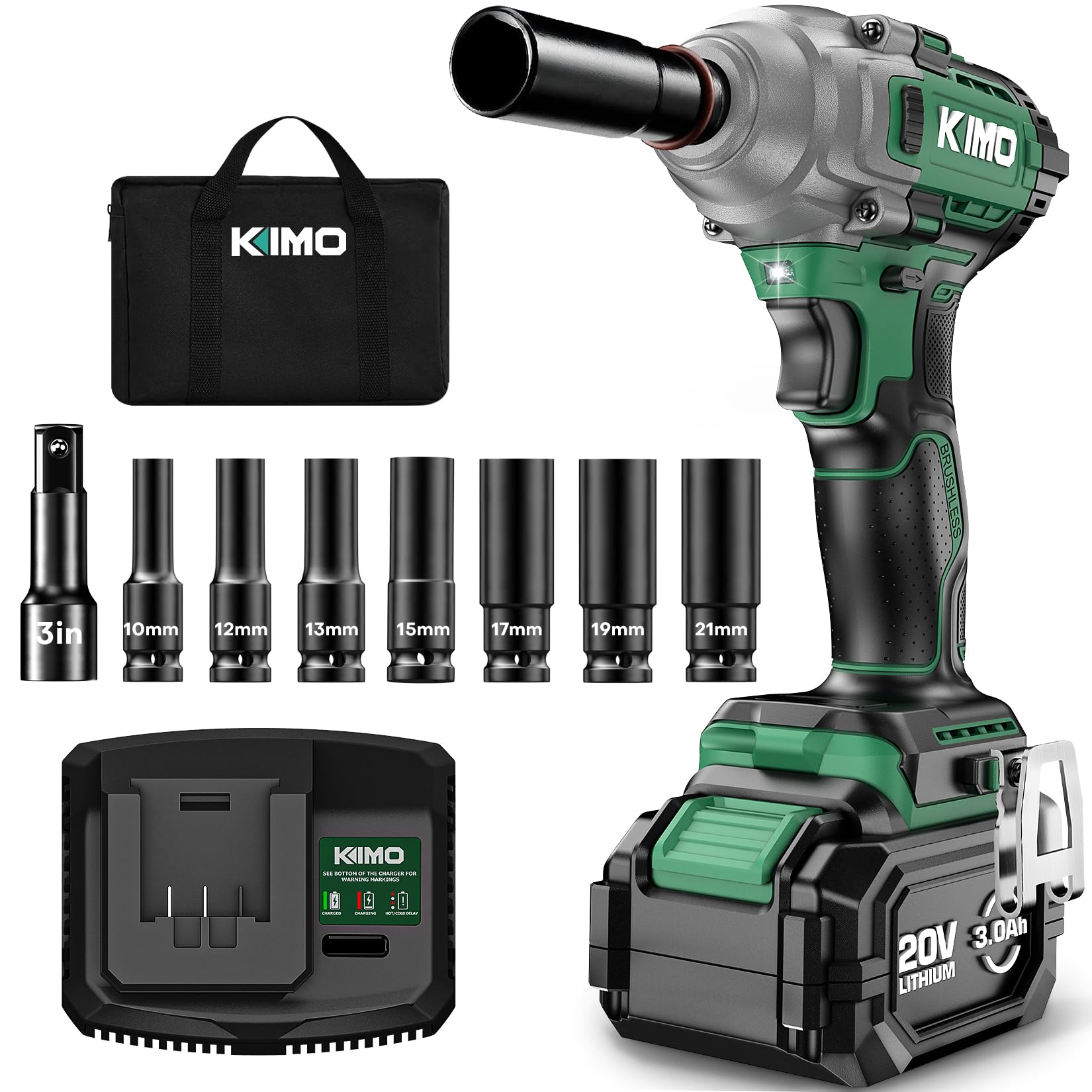 ใ๐๐ก๐ ๐๐จ๐๐ณ๐ข๐ฅ๐ฅ๐ ๐จ๐ ๐๐ฆ๐ฉ๐๐๐ญ ๐๐ซ๐๐ง๐๐กใThe KIMO 1/2 impact wrench kit includes 7 *sockets (10/12/13/15/17/19/21mm), 1*3-inch extension bar, 1*3.0Ah Li-ion battery, 1* Fast Charger,1* Tool bag, allowing you to tackle a wide range of tasks without needing to purchase additional accessories.