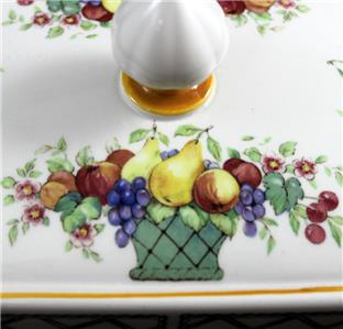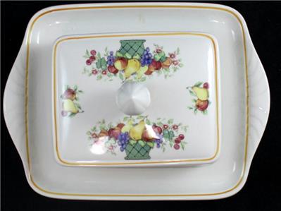 This attractive pattern was produced by Villeroy & Boch from 1983 through 2007 and is now discontinued. It features a centered fruit basket design on white with a green lattice rim and yellow band.