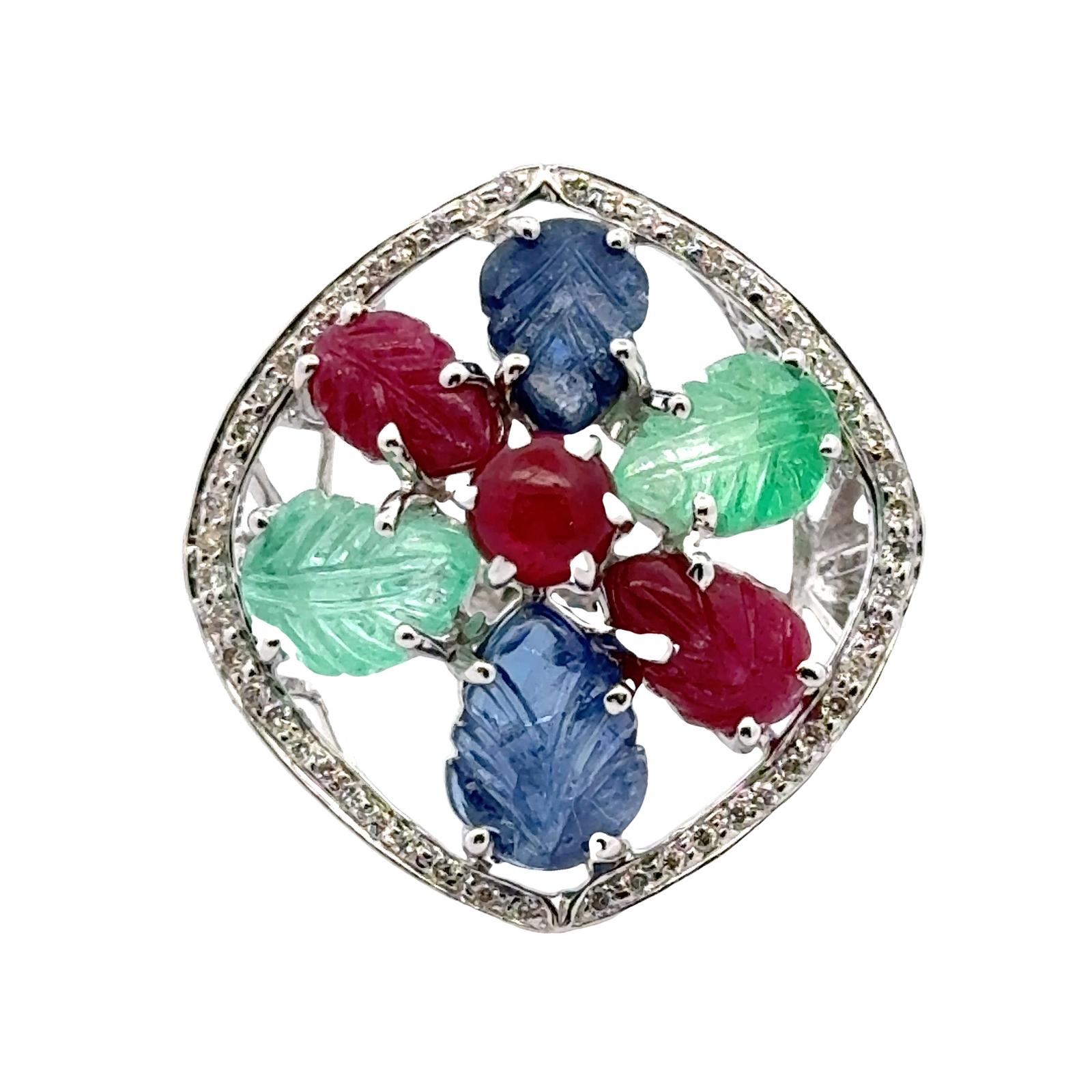The 18k white gold tutti frutti diamond sapphire ruby emerald cocktail ring is a dazzling statement piece that combines luxurious materials with a vibrant array of gemstones. Its bold design, exquisite craftsmanship, and vibrant carved gemstones make it a standout piece that is sure to turn heads and capture attention wherever it goes. The ring is adorned with 50 round brilliant cut diamonds weighing approximately .25 CTW. The ring measures 25 x 25mm on top and is currently size 7 (can be sized).