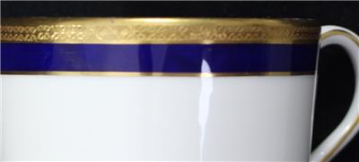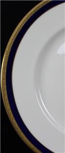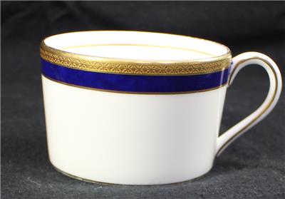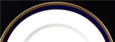 This elegant pattern was produced by Coalport from 1972 through 1986 and is now discontinued. It features a cobalt blue and gold-encrusted border and a white center.