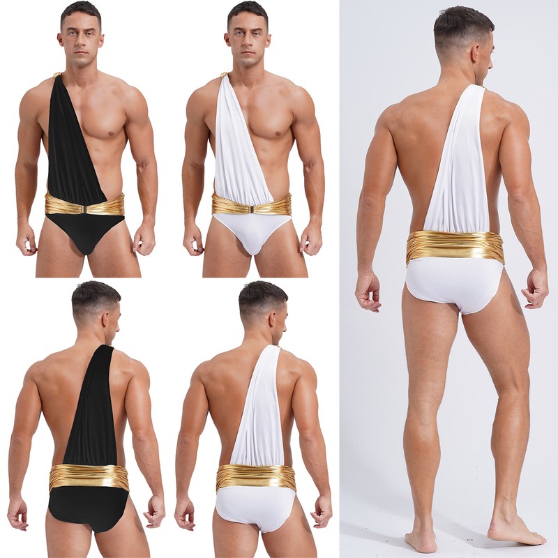 Styled with ancient Greek costume, one-piece bodysuit designs with one shoulder drape, metallic shiny belt and integrated briefs.
