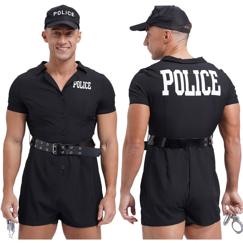 Men Romper Security Guard Bodysuit Belt Costume Cops Uniform Halloween OutfitsUSD 7.99
