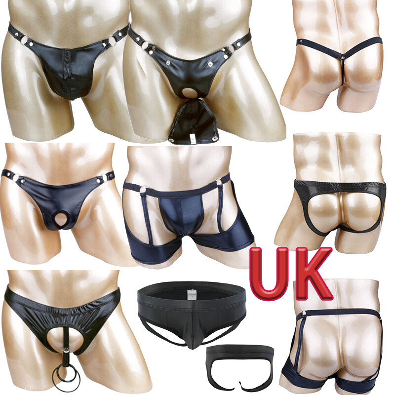 Front with strappy hollow out penis holes and bulge pouch.