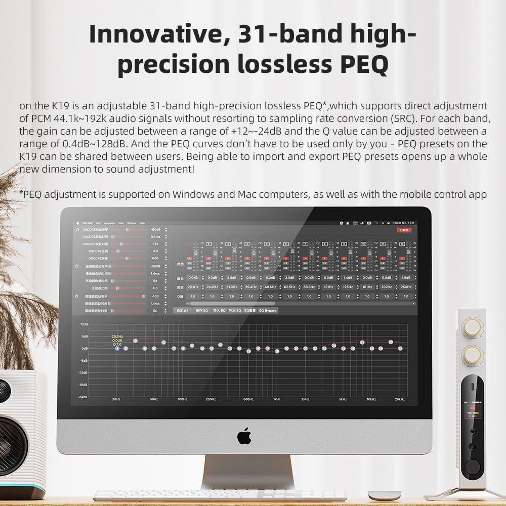 - K19 is a flagship desktop decoding and headphone amplifier all-in-one machine, mainly used to connect to computers, mobile phones, tablets, HiFi players, and other devices, and improve the sound quality of existing devices through K19's decoding and amplification. It also supports 31-segment high-precision lossless PEQ adjustment function.