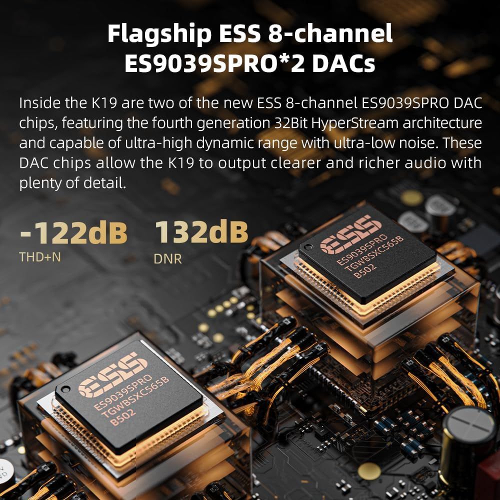 - K19 is equipped with two ESS flagship 8-channel DAC ES9039SPRO, providing clearer and more detailed sound, and a more immersive listening experience.