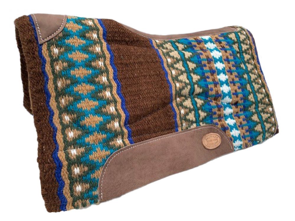 Showman Brown, Royal Blue & Turquoise Wool Saddle Pad w/ Memory Felt. This pad features a wool top with brown, royal blue and turquoise colors with a memory felt bottom. Pad is equipped with gel inserts along bars to help absorb impact. Saddle pad has oversized wear leathers and a contoured leather spine for a perfect fit. Measures: 36" x 34".