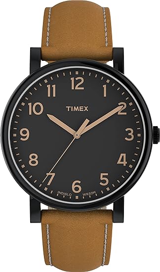 Black Stainless steel case. Brown leather band. Black dial. Case size: 42mm. Mineral Glass. Water resistant 30 meters. Quartz movement.