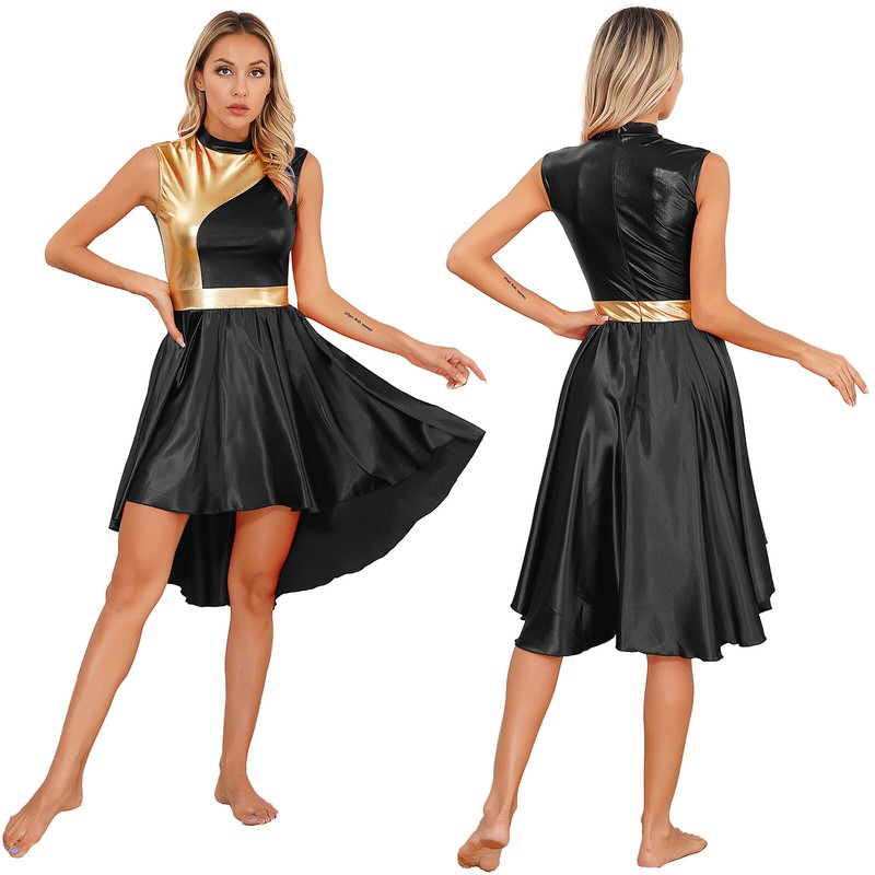 Sleeveless dance dress for women, mock neck, color block patchwork design, back with invisible zipper closure for easy wearing.