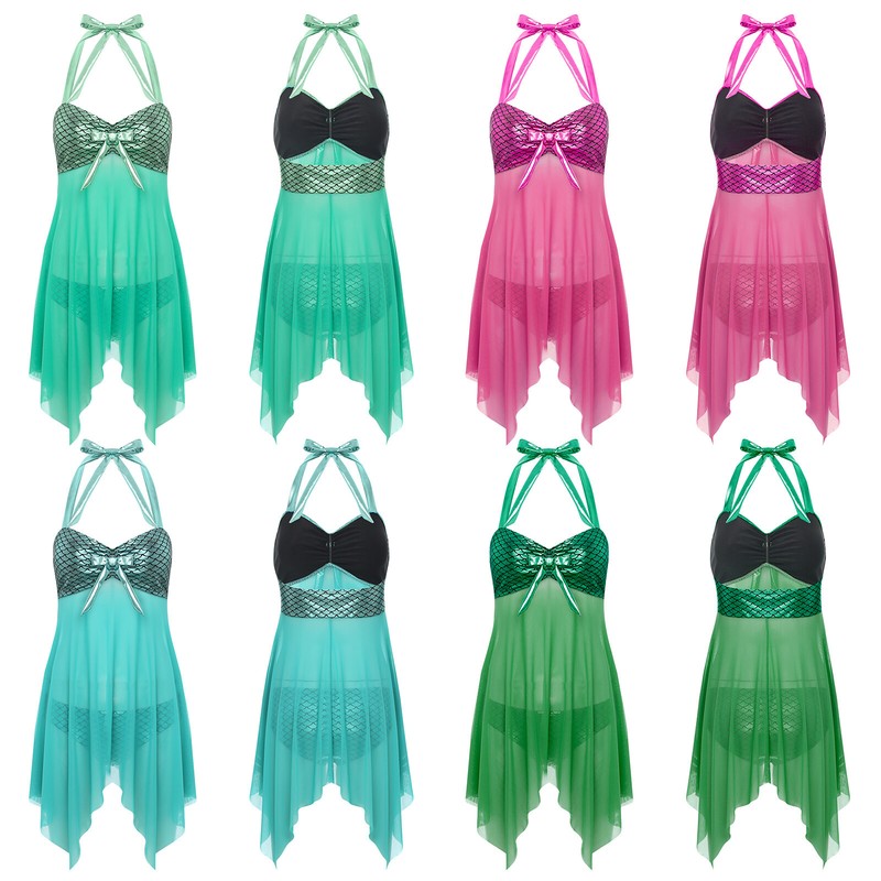 2-piece swimsuit includes swimming dress and briefs. Designed with tying halter, sleeveless, pad-free, asymmetrical mesh skirt.