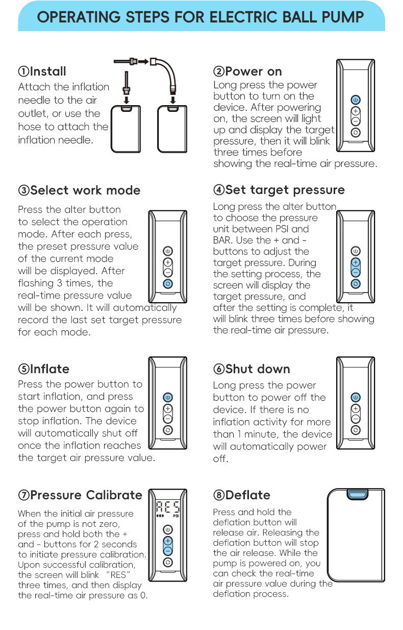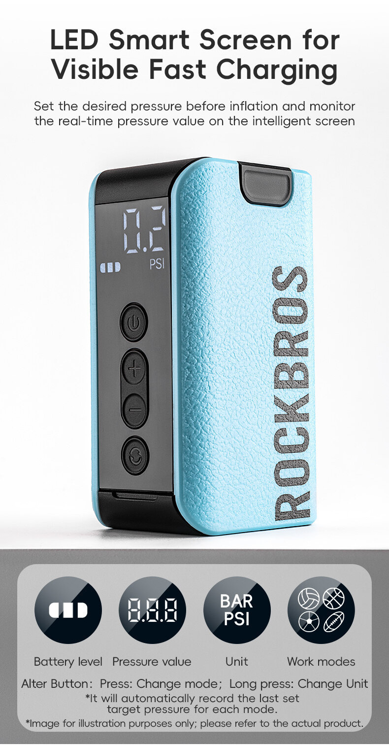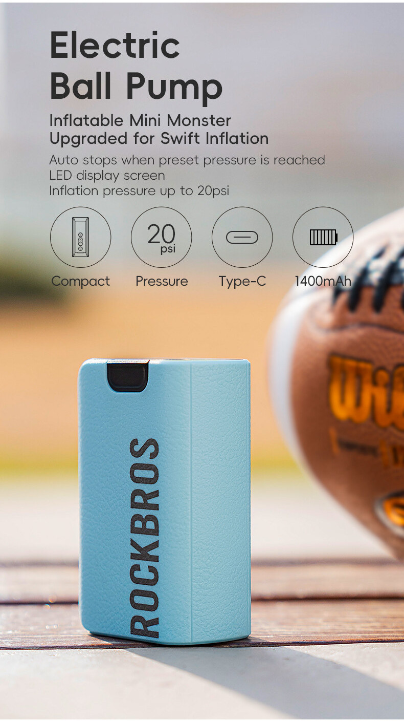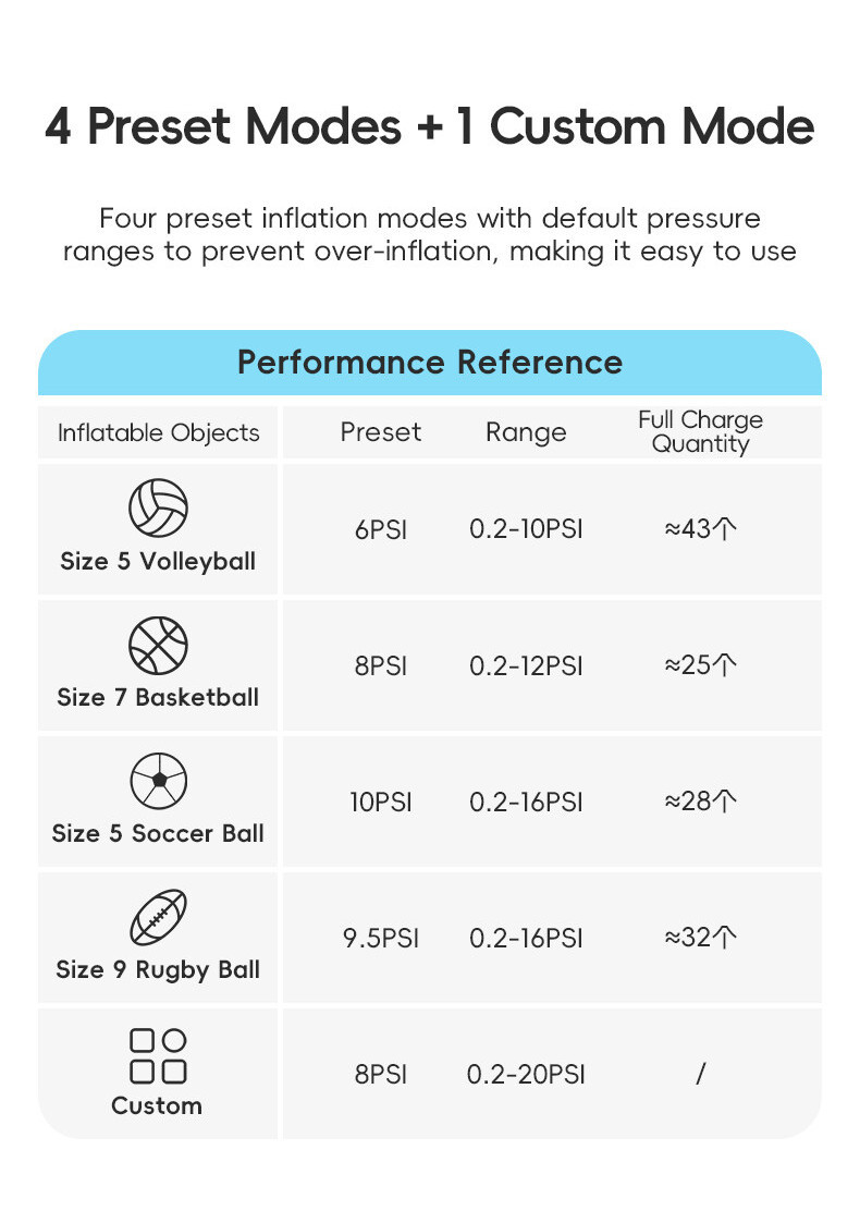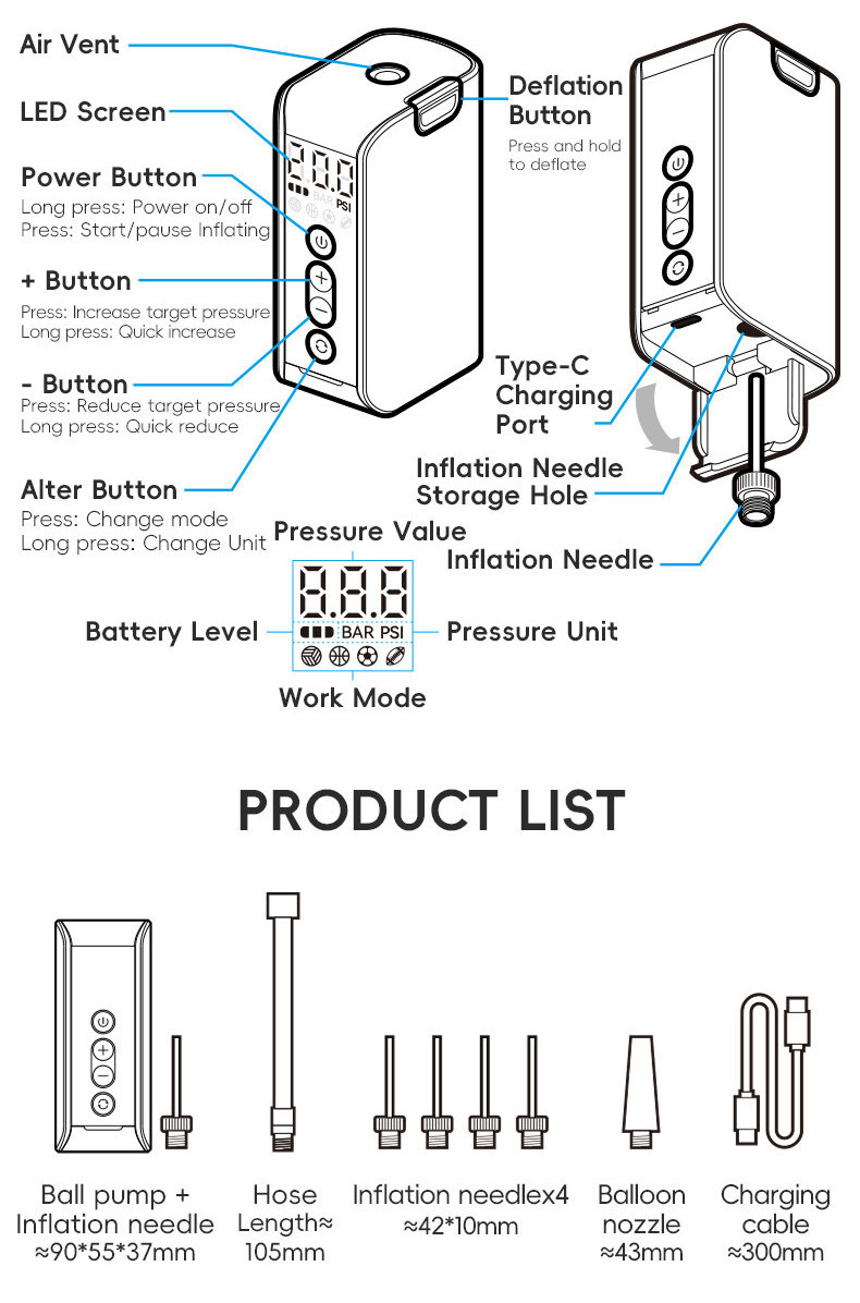 Product Features 1.Preset+custom pressure mode automatic stop 2.Long battery life can inflate ≈25-40pcs different balls ,rugby, football, basketball, volleyball,swim ring 3.LED Intelligent display screen ,check pressure.battery,mode 4.Type-C charging with battery indicator 5.Lightweight 175g, portable easy to store and carry 6.Automatic shutdown battery protection
