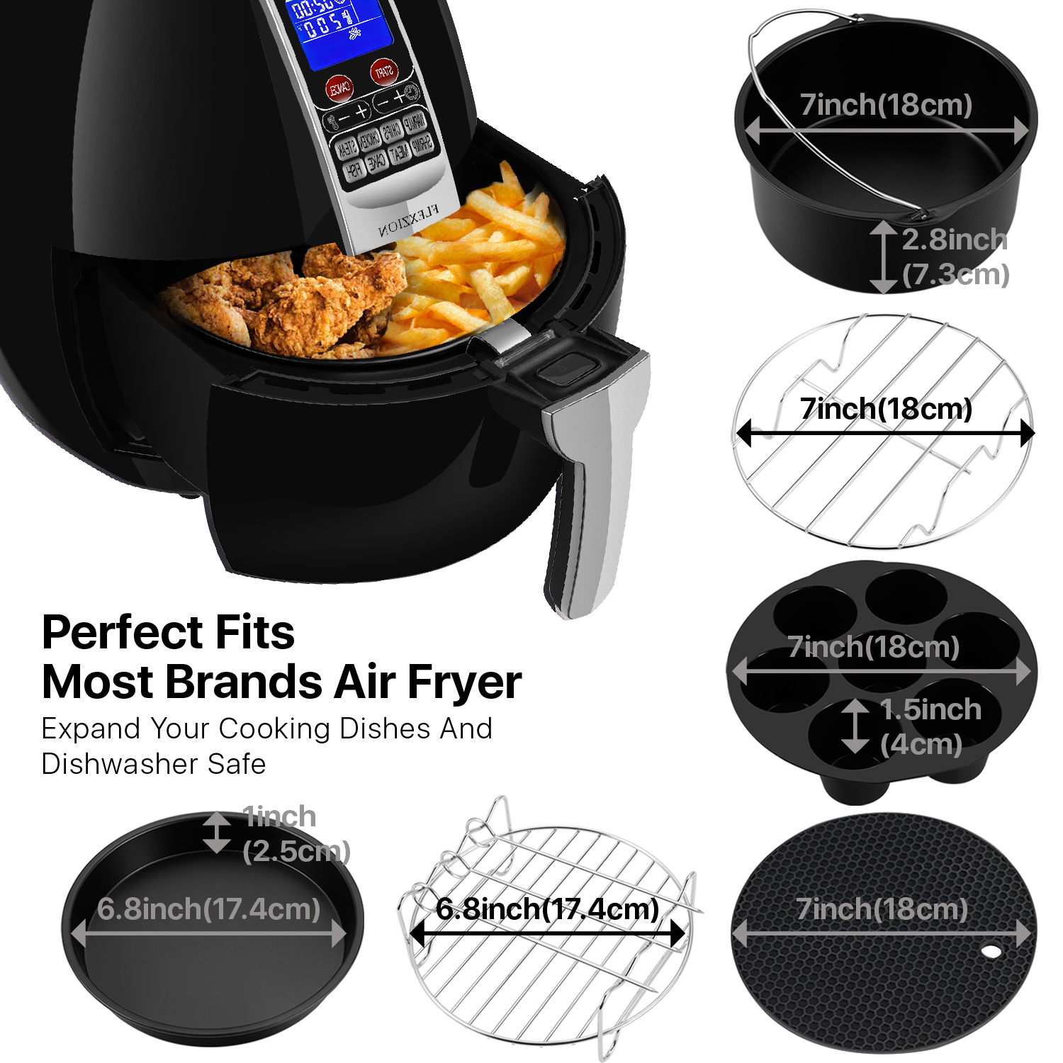 Running out of diversity and variations cooking with the stock air fryer basket and tired of cooking chicken, fries, and nuggets? Provide even, balanced and diverse nutritious food and cuisines for the whole family with an air fryer essential accessory kit. Cake Barrel: Bake your favorite cake, bread or quiche in the Cake Barrel! Even cook rice in it, easy to clean nonstick pan. Pizza Pan: Aside from experimenting with different pizza recipes, this Pizza Pan also provides the perfect surface for a variety of other treats! You can use it to make pancakes, eggs, potatoes, quesadillas or even giant cookies! With the air fryer accessories grill pan, the possibilities are limitless! Metal Holder: Maximize your cooking surface with the Metal Holder. Double layered efficiency, even allows for the juices on the top layer to marinate the bottom while cooking. Multi-Purpose Rack with Skewers: The Multi-Purpose Rack not only maximizes your cooking space, but it also comes with 3 skewers. These skewers are perfect for vegetable and meat shish kabobs while the bottom layer is perfect for sides! Silicone Mat: The Silicone Mat provides you with a heat-resistant surface to place your hot accessories on. Use an oven-safe mitt to remove your accessory from the air fryer and place it on the Silicone Mat. Cup Cake / Muffin Pan: Cook your favorite desserts with cupcake pan, perfect for breakfast lunch or dinner! WARNING: Do not touch the accessories until they have completely cooled!Feature:
