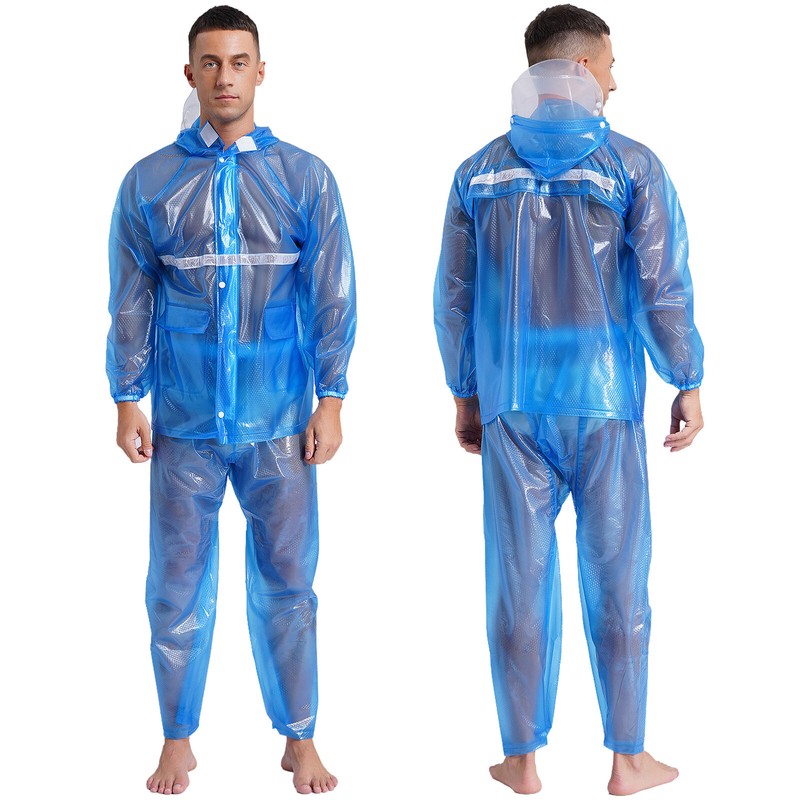 Reflective strips keep you safe on rainy days and at night. Matching with elastic waistband long pants, 2-piece raincoat suit fits for men and women.
