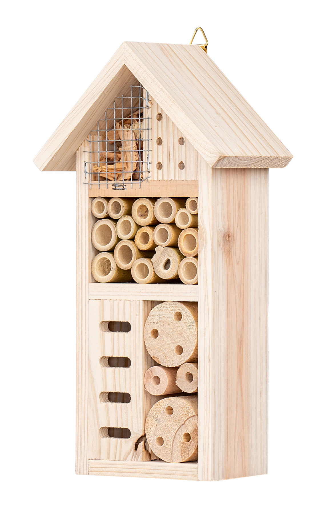 Das Insektenhotel bietet fleißigen Helfern wie Bienen, Wespen, Käfern und Schmetterlingen einen sicheren Unterschlupf. Es ist aus robustem Tannenholz gefertigt und in einer natürlichen Farbe gehalten, sodass es sich harmonisch in jeden Garten einfügt.