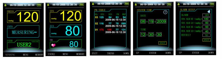 4.Physiological alarm function, alarm limits can be set the alarm limits. When blood pressure is higher than the high limit or lower than the low limit, the alarm will occur. Alarm switch can be set.