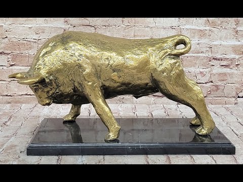 This Gold Limited Edition Stock Market Bull Bronze Sculpture by the renowned artist Marius is a powerful and dynamic representation of market strength and prosperity. Handcrafted using the traditional lost wax method, this sculpture captures the formidable energy and bullish confidence of the stock market bull, a symbol of financial optimism and growth. Marius's expertise in sculpting is evident in the intricate details and lifelike form of this commanding figure.The sculpture features a luxurious gold patina, which adds a stunning and opulent finish to the piece. This gold patina not only enhances the visual appeal of the sculpture but also symbolizes wealth and success, making it an ideal piece for financial professionals, investors, or anyone with a keen interest in the stock market. The rich, gleaming tones of the gold patina create a striking contrast with the polished black marble base, further elevating the sculpture's sophisticated appearance.Mounted on a sleek black marble base, the sculpture gains an added touch of elegance and stability. The black marble provides a perfect foundation for the golden bull, enhancing its overall impact and presence. Each piece is signed and numbered by Marius, ensuring its authenticity and limited edition status, making it a valuable collectible.This Gold Limited Edition Stock Market Bull Bronze Sculpture is a perfect addition to any office, study, or financial institution, serving as both an inspirational symbol and a testament to fine craftsmanship. Its impressive design and high-quality construction make it a standout piece that will inspire admiration and conversation, celebrating the enduring spirit of the stock market's bullish optimism.