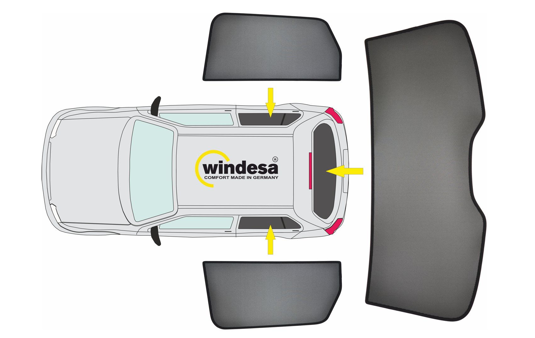 Unser SunClip ist ein einteiliger Sonnenschutz an der Heckscheibe. Dadurch ist die Sicht nach außen ungehindert. →