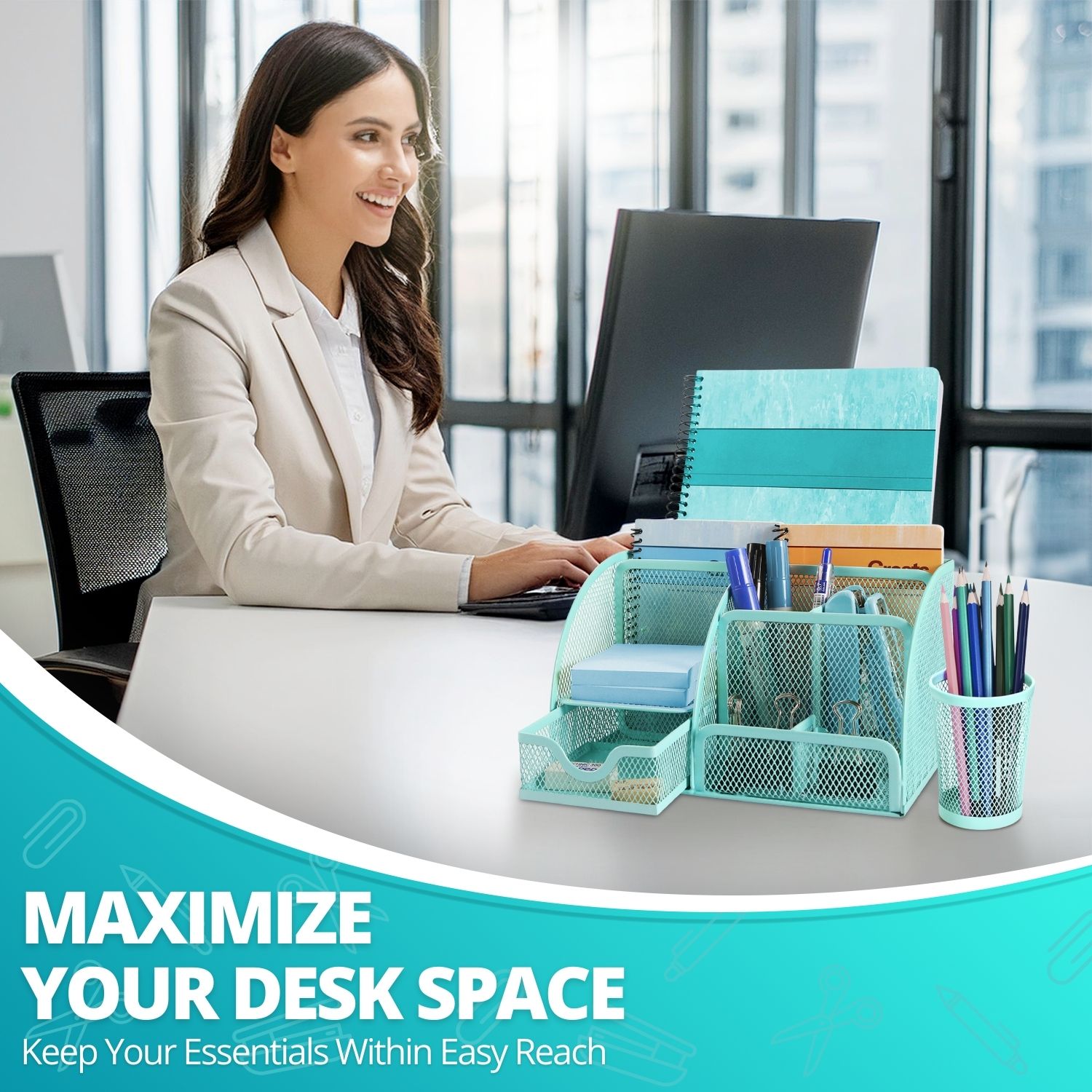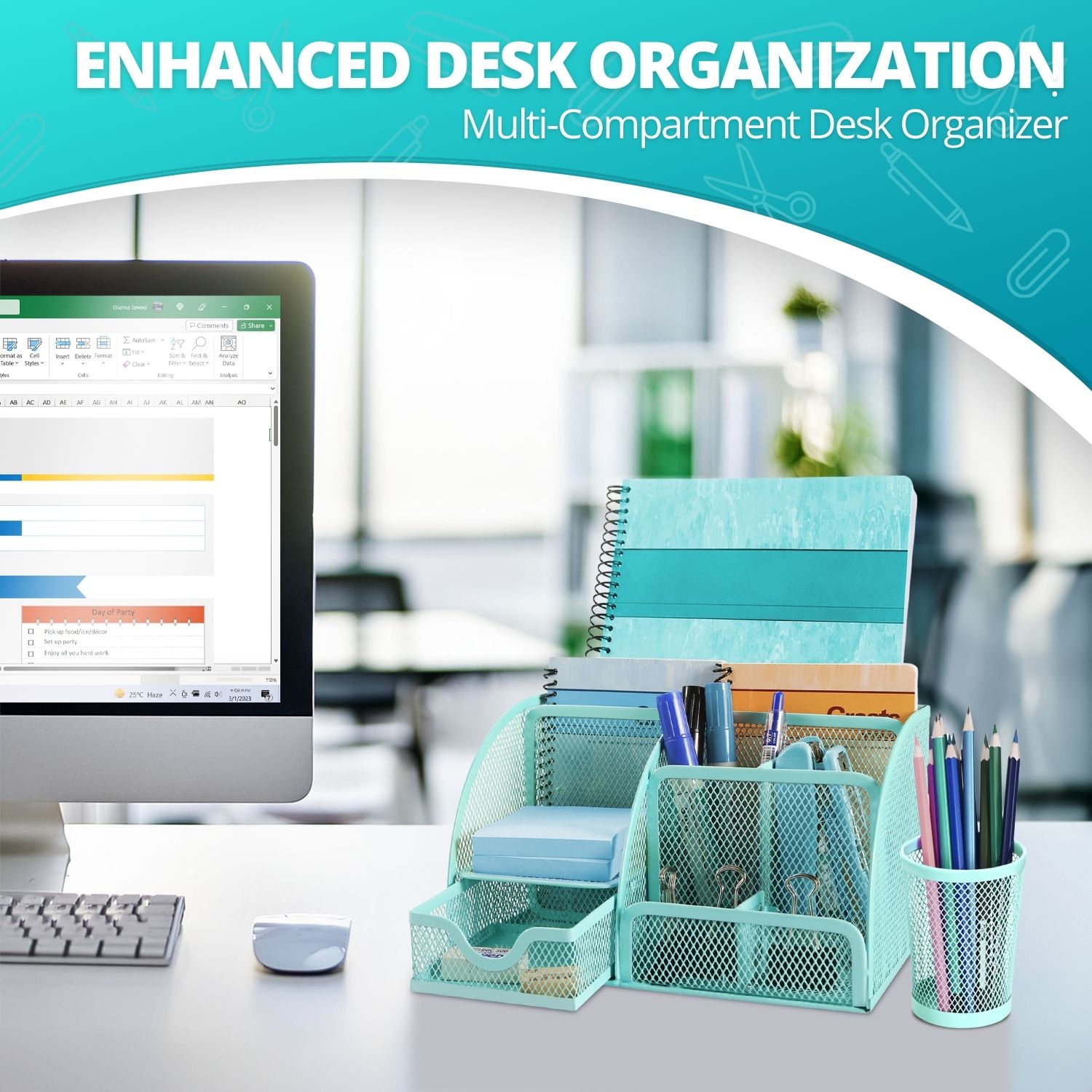 Introducing our Metal Mesh Desktop Organizer - a perfect blend of style, functionality, and durability. Designed for modern-day students and professionals, it features six compartments, one drawer, and a pen holder to conveniently store your desk essentials. No more searching for that paper clip or sticky note - there's a spot for all! This desktop organization caddy is constructed from durable metal mesh. It is designed to withstand daily use while maintaining its sleek look. Its minimalist design adds a touch of sophistication to any workspace, making them desk sets and accessories for women and men. The compact footprint of this cute desk organizer maximizes your desk space, making it an excellent solution for small workstations. Our office desk organizers and accessories brighten a bustling office or a tranquil home study. It's an asset for maintaining a clutter-free workspace and supercharging productivity. Amplify your efficiency with our Metal Mesh Office Organization for Women and Men today!Feature: