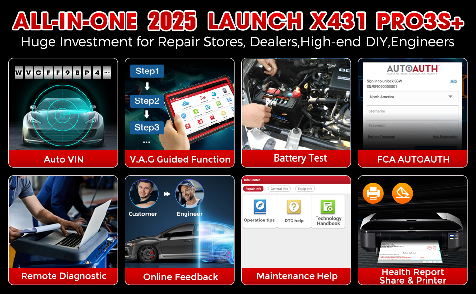 Elite-Version 2026 fügt neue erweiterte OEM-Funktionen hinzu:Als beliebtester LAUNCH X431-Scanner wurde X431 PRO3S+ von den Amazon-Redakteuren als „Bestes professionelles Diagnosetool“ empfohlen! KOSTENLOSE VAG-Führungsfunktion (kompatibel mit VW, AUDI, SKODA, SEAT); ECU-Codierung; AutoAuth für FCA SGW (kostenlos) macht es kompatibel mit Chrysler, Dodge, Jeep, Alfa Romeo und Fiat nach 2017; Kompatibel mit HD-Modul, unterstützt 24-V-Diesel-Schwerlast-Lkw; ADAS mobile/ADAS pro führen die ADAS-Kalibrierung durch.