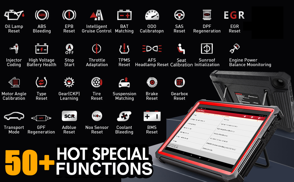 Über 100 Reparaturfunktionen für bestimmte Fahrzeuge (Katalog im Fahrzeug) Darüber hinaus hat das Launch-Scan-Tool auch über 100 Spezialfunktionen für bestimmte Modelle entwickelt (einige Modelle bis zu 300+). Im Vergleich zu anderen Diagnosescannern, die nur die Reset-Funktion ausführen können, kann der bidirektionale Scanner eine tiefergehende Initialisierung, Anpassung, Regeneration, Anpassung, Kalibrierung, Austausch usw. durchführen.