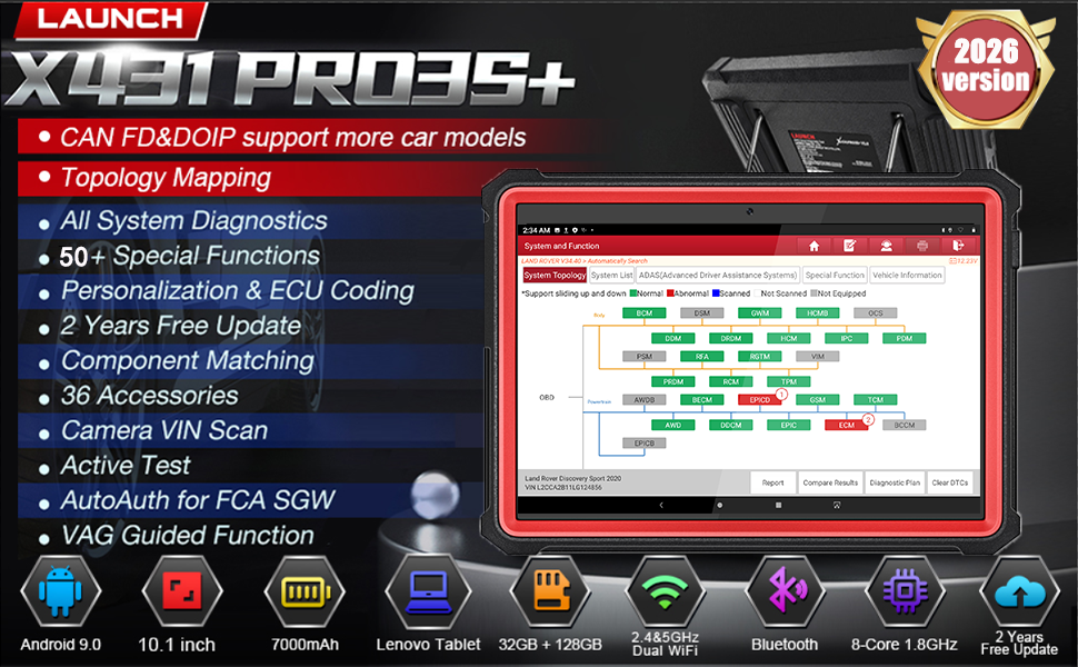 Elite-Version 2026: Neue erweiterte OEM-Funktionen hinzufügen: Aktualisieren Sie ab sofort Ihr X431 PRO3S+ auf V 7.00.012, um die Topologie-Mapping-Funktion zu erhalten. Als beliebtester LAUNCH X431-Scanner wurde X431 PRO3S+ Pro Elite von den Amazon-Redakteuren als „Bestes professionelles Diagnosetool“ empfohlen! KOSTENLOSE VAG-Führungsfunktion (kompatibel mit VW, AUDI, SKODA, SEAT); AutoAuth für FCA SGW (kostenlos); Kompatibel mit HD-Modul, unterstützt schwere 24-V-Diesel-Lkw; ADAS mobile/ADAS pro führt die ADAS-Kalibrierung durch.