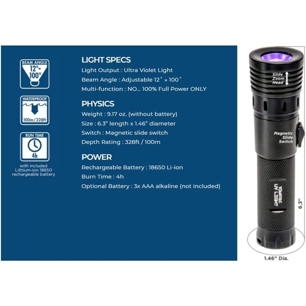 The light beam has a variable underwater coverage angle of 12-100°. This range makes the Tovatec UV a versatile light capable of stimulating a single coral with a tight, focused beam or exciting a large section of a reef with a much wider, more diffuse beam. The included 18650 battery provides a runtime of 4 hours and is compatible with the bundled USB charger.