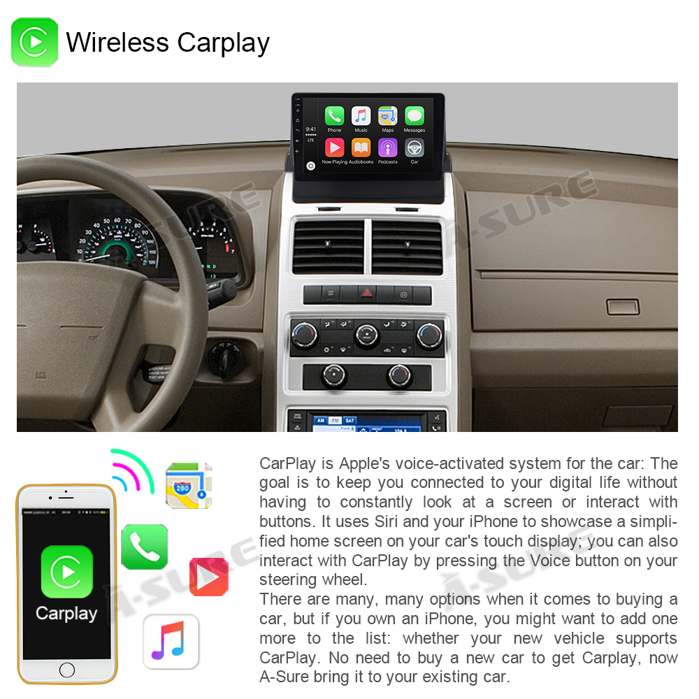 ● Wireless & Wired Carplay: wired or wireless Carplay in-vehicle system can closely integrate the user's iOS device and iOS experience with the dashboard system. Users who use wireless Carplay can connect to the car system via Bluetooth to realize voice-controlled navigation, make calls, send and receive messages, and listen to music. It is only available for iPhone(Carlink APP) .