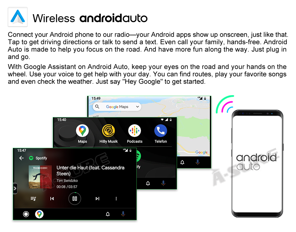 ● Wireless & Wired Android auto: wired or wireless Android auto in-vehicle system can closely integrate the user's Android device and Android experience with the dashboard system. Users who use wireless Android auto can connect to the car system via Bluetooth to realize voice-controlled navigation, make calls, send and receive messages, and listen to music. It is only available for Android phone(Android phones need to download android auto APP) .