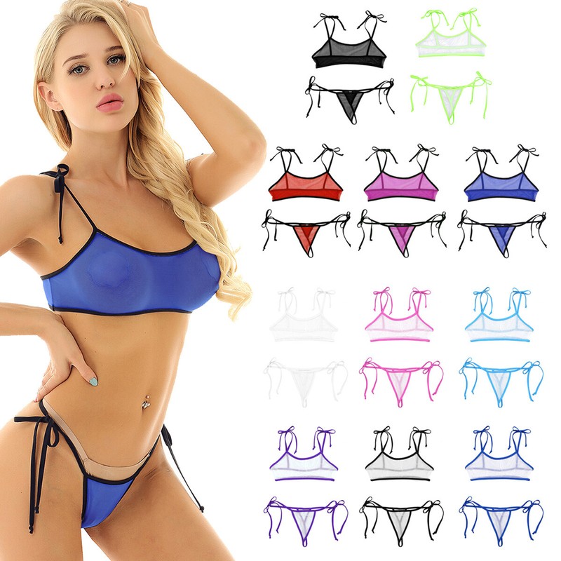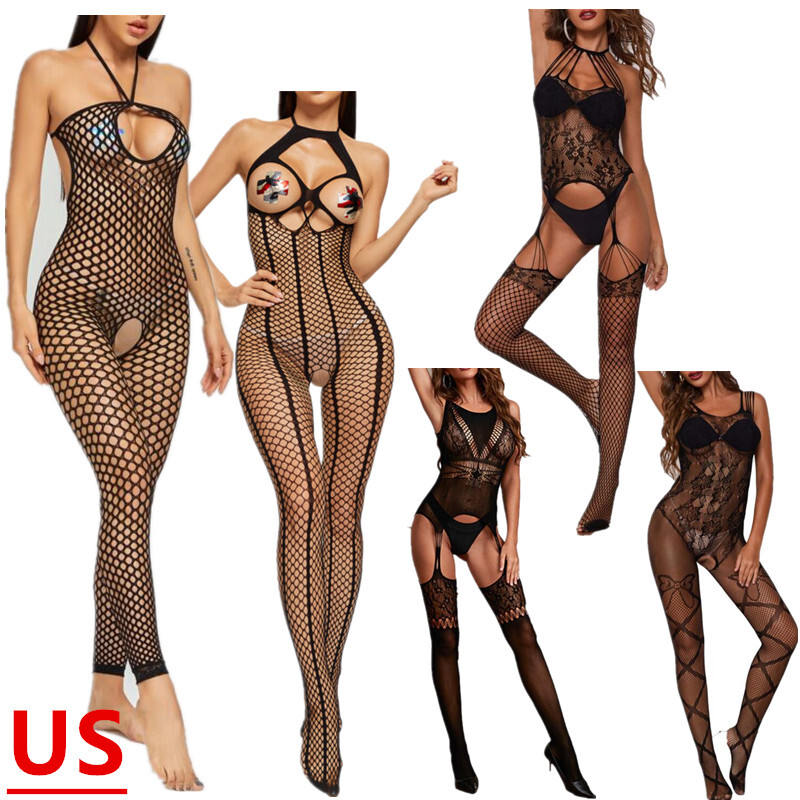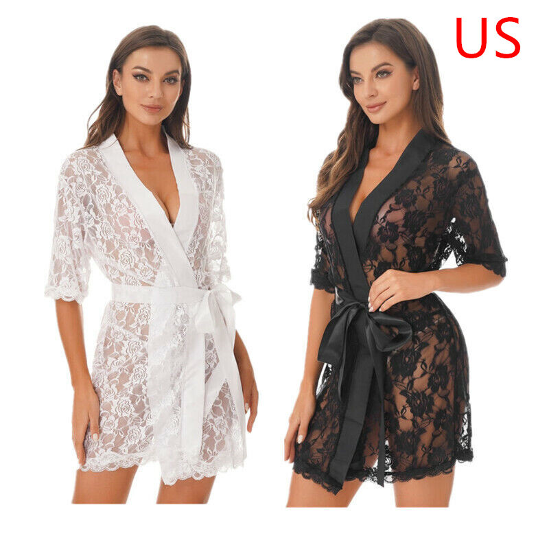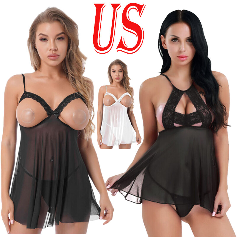 Womens Sheer Mesh Lingerie Set Lace Trim Open Cup Babydolls Dress with G-string.