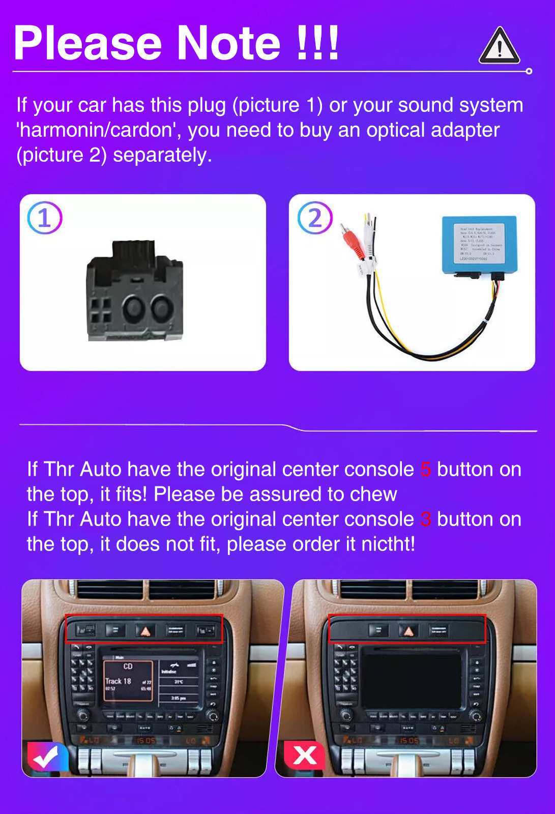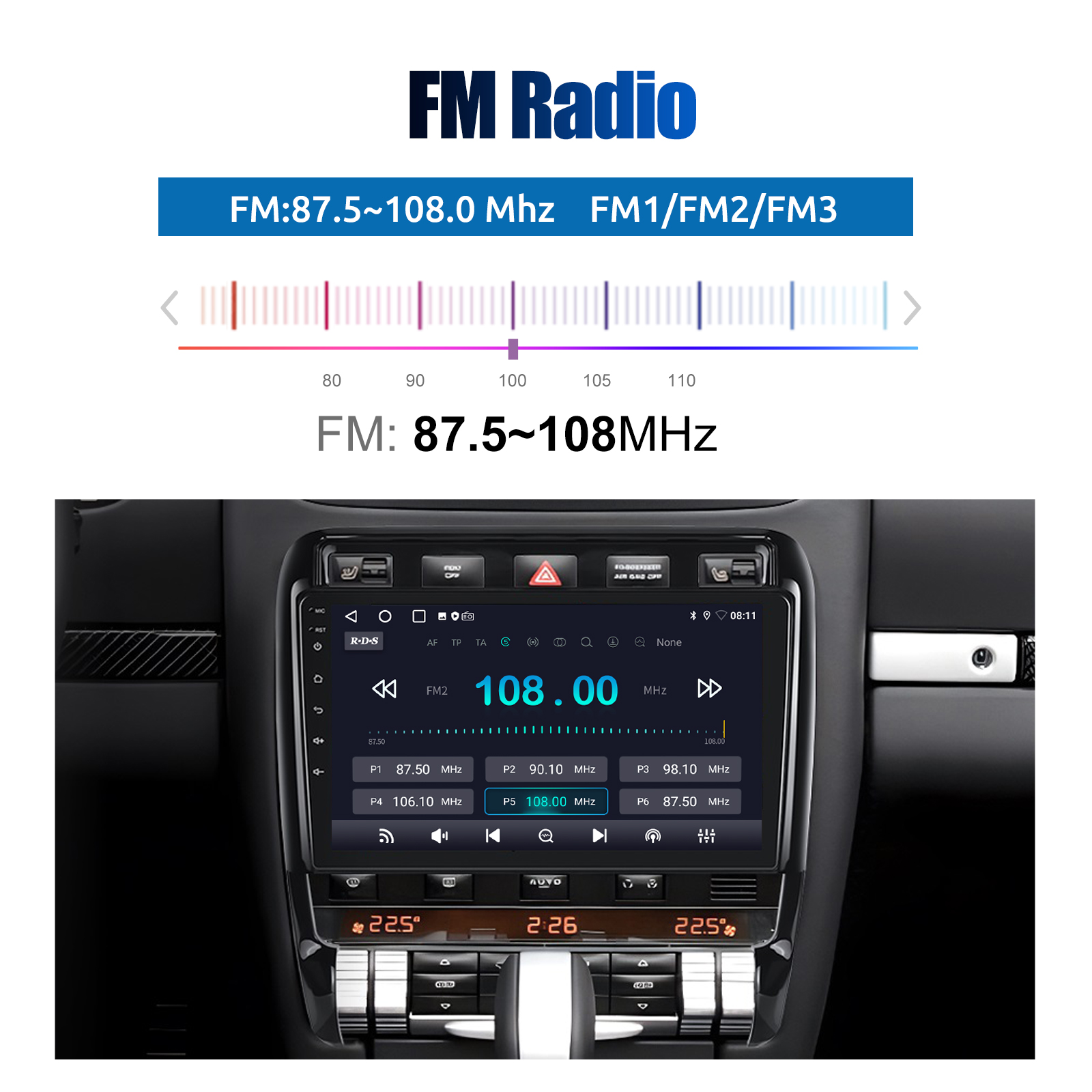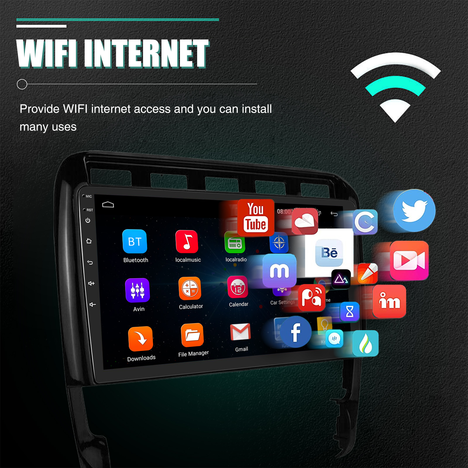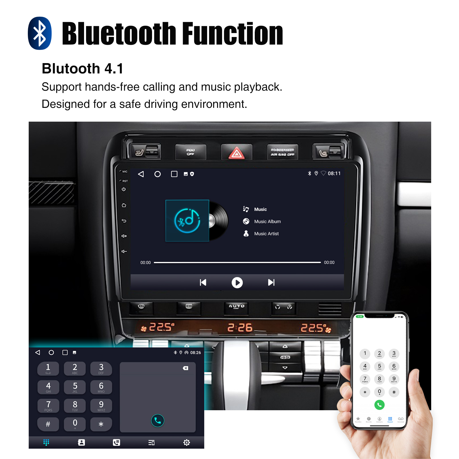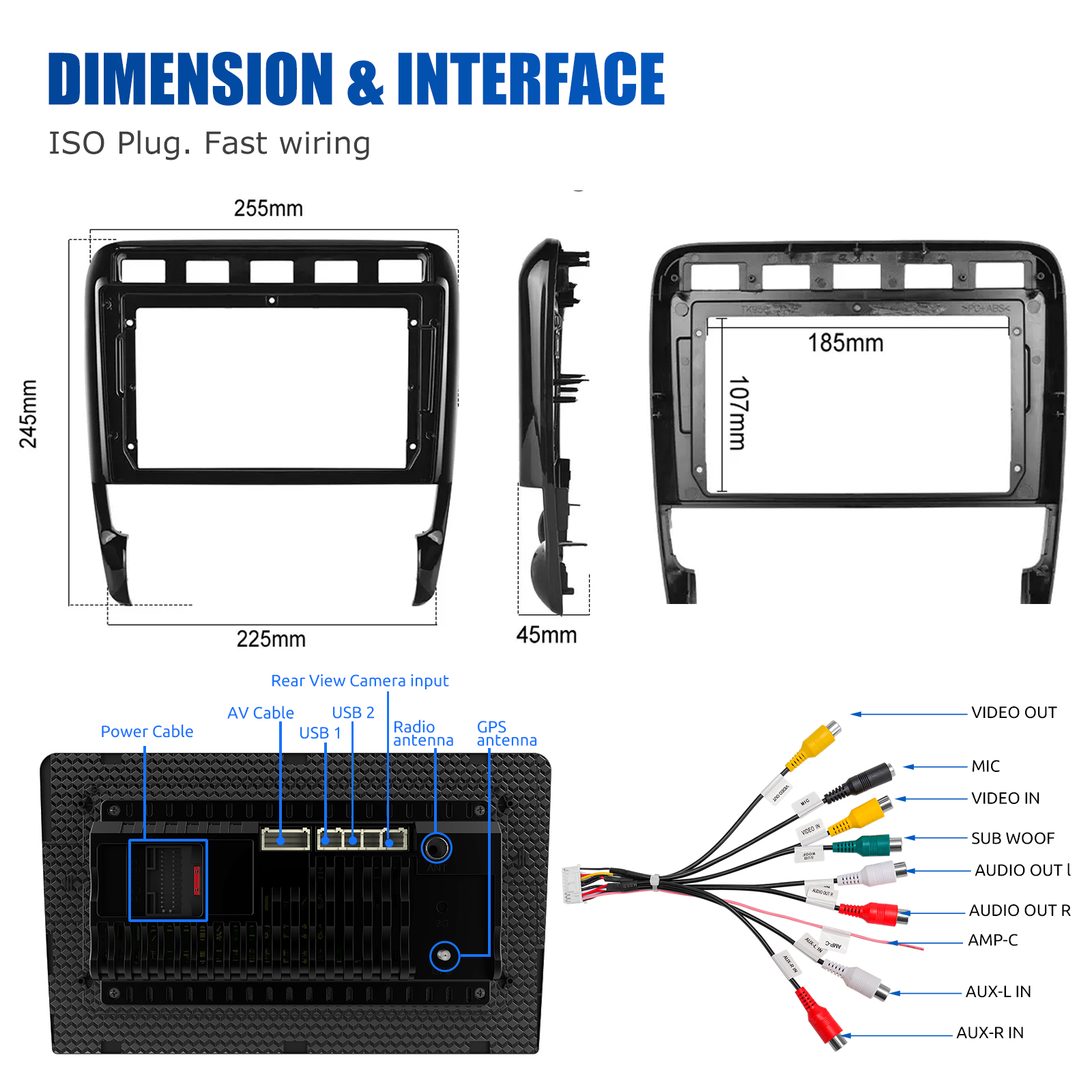 10.1 Inch Android 13 Car Radio For Porsche Cayenne 9PA: The Android car radio with 9" 1280* 720 HD IPS capacitive touchscreen, 4GB RAM and 64GB ROM allows you to download your favorite apps and videos, so driving is no longer boring. No extra frame, no cable change, plug and play. It comes with Canbus and supports most of the original functions: steering wheel control, reverse signals and reading original computer data, etc.