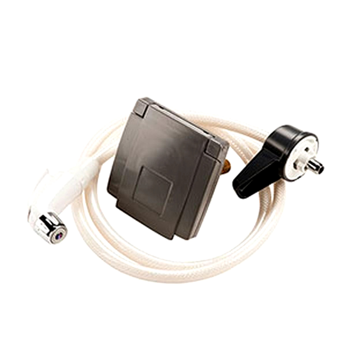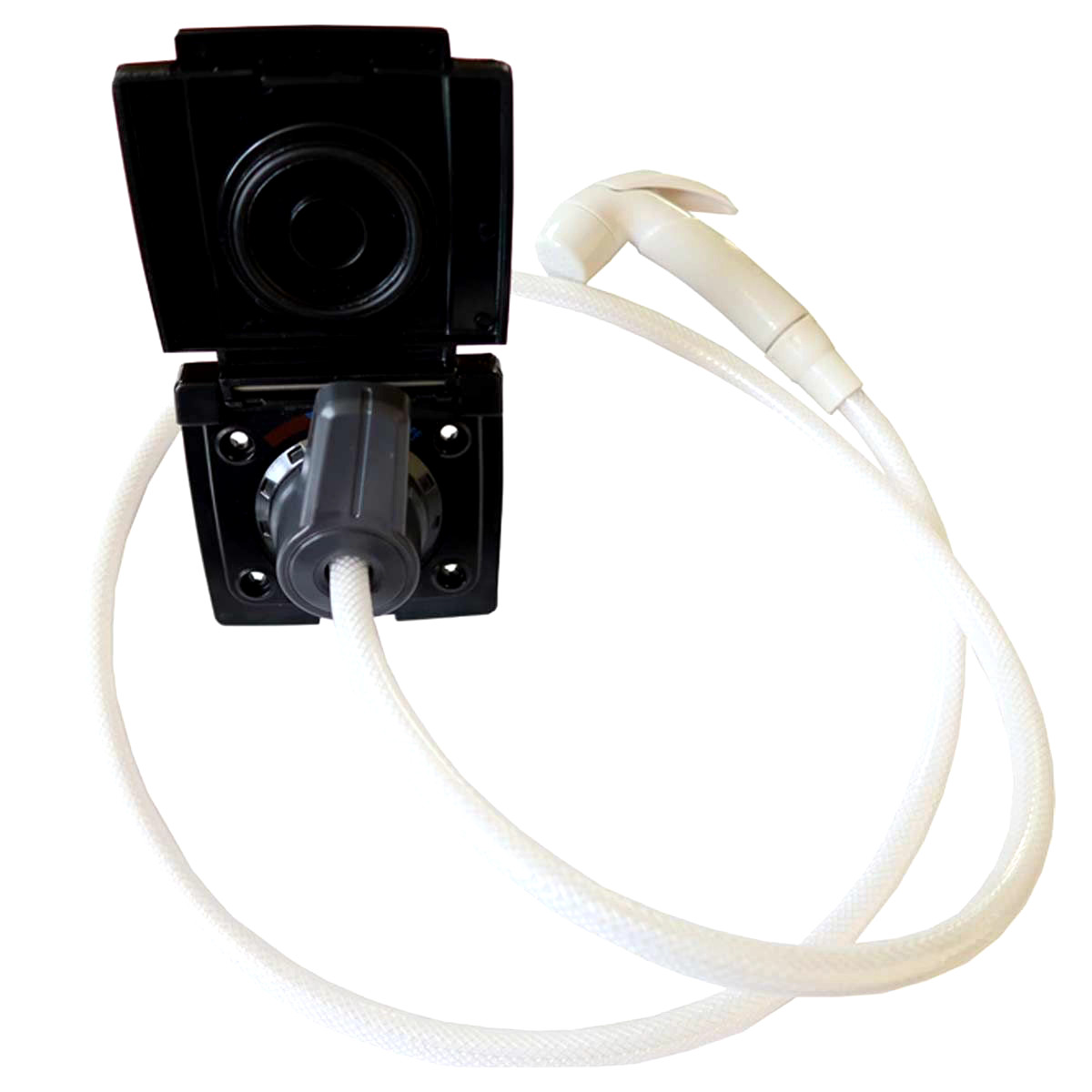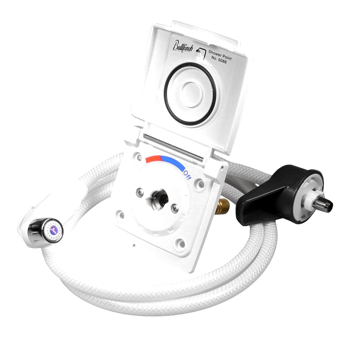 The External shower point comes complete with a Shower head assembly (shower fitting, shower hose and swivel head). It uses the unit’s existing hot and cold water supplies. Inserting the shower assembly, locks it in place and turns on the water. Temperature adjustment by turning the assembly.