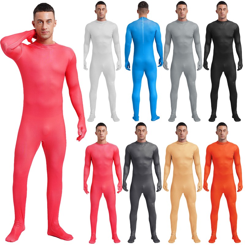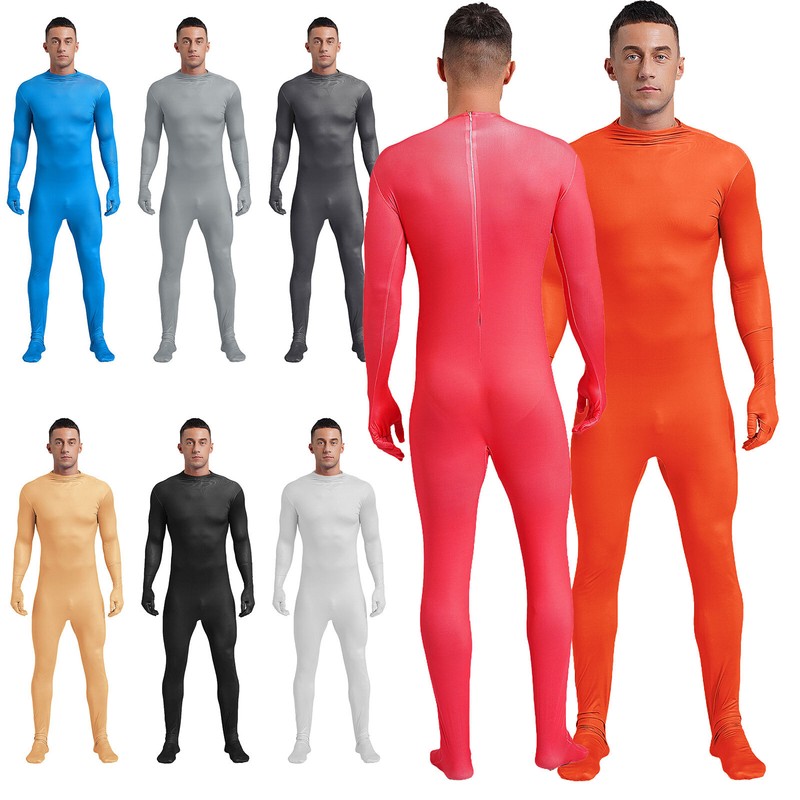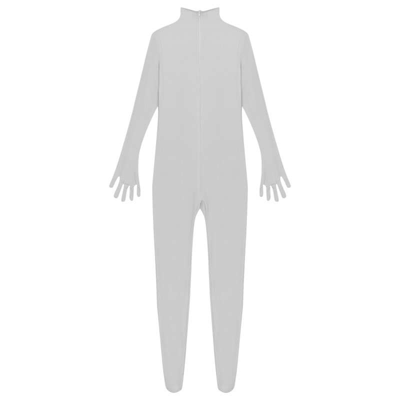 Full-body unitard is designed with stand collar, long sleeve, integrated gloves and sock, back zipper closure, slim fit and solid color.