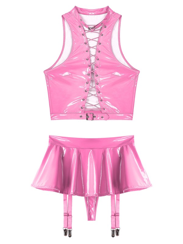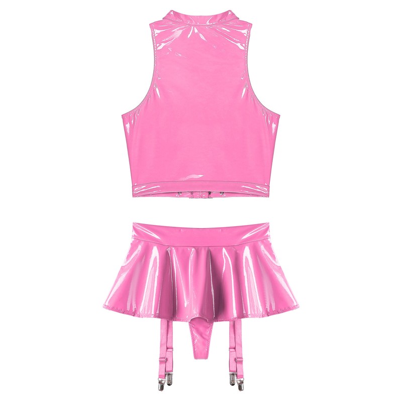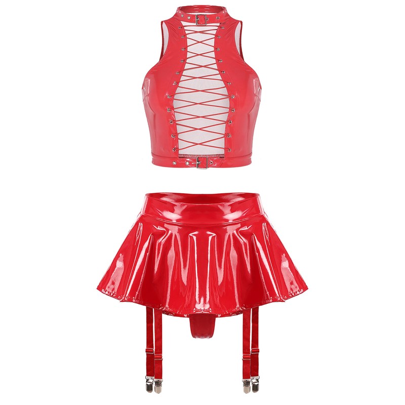 2-piece patent leather set have a wet look and glossy surface to bring endlessly wild and teasing, deeply attracting your lover.