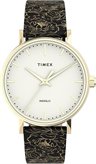 Timex Womens Fairfield Floral 37mm Watch - Cream Dial Gold Case with Foil Patterned Black Leather Strap.