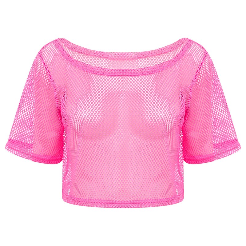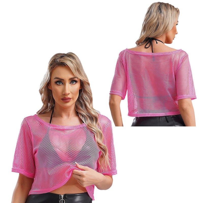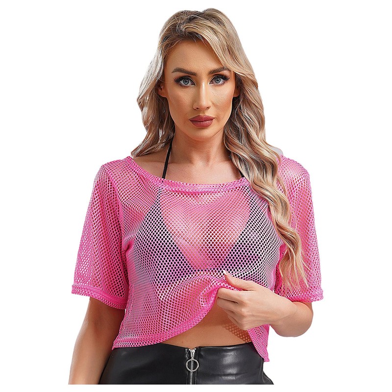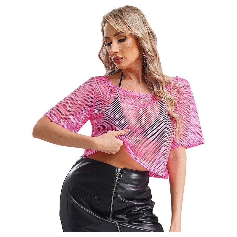 See-through mesh T-shirt works well with camisole, bra top, tank top, vest, jeans, shorts and skirts, creating a retro 1980s disco look.