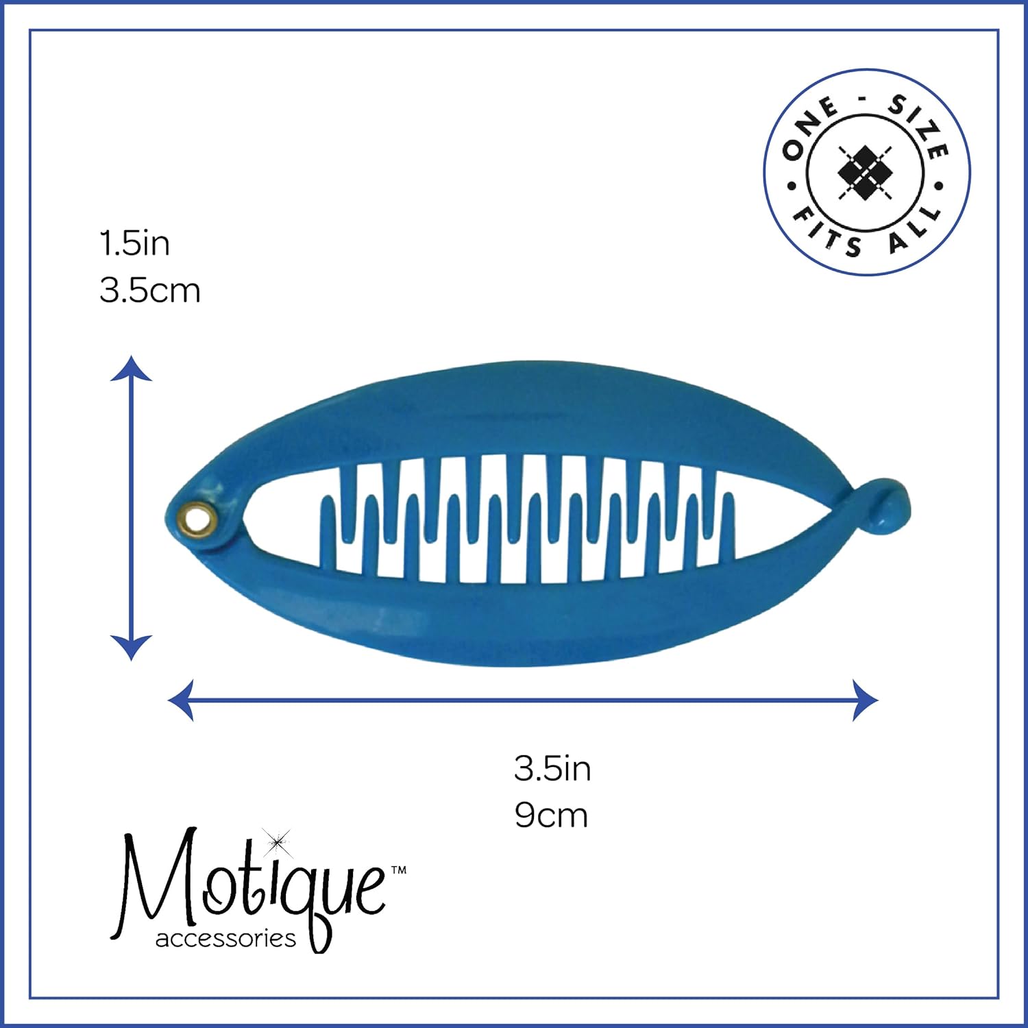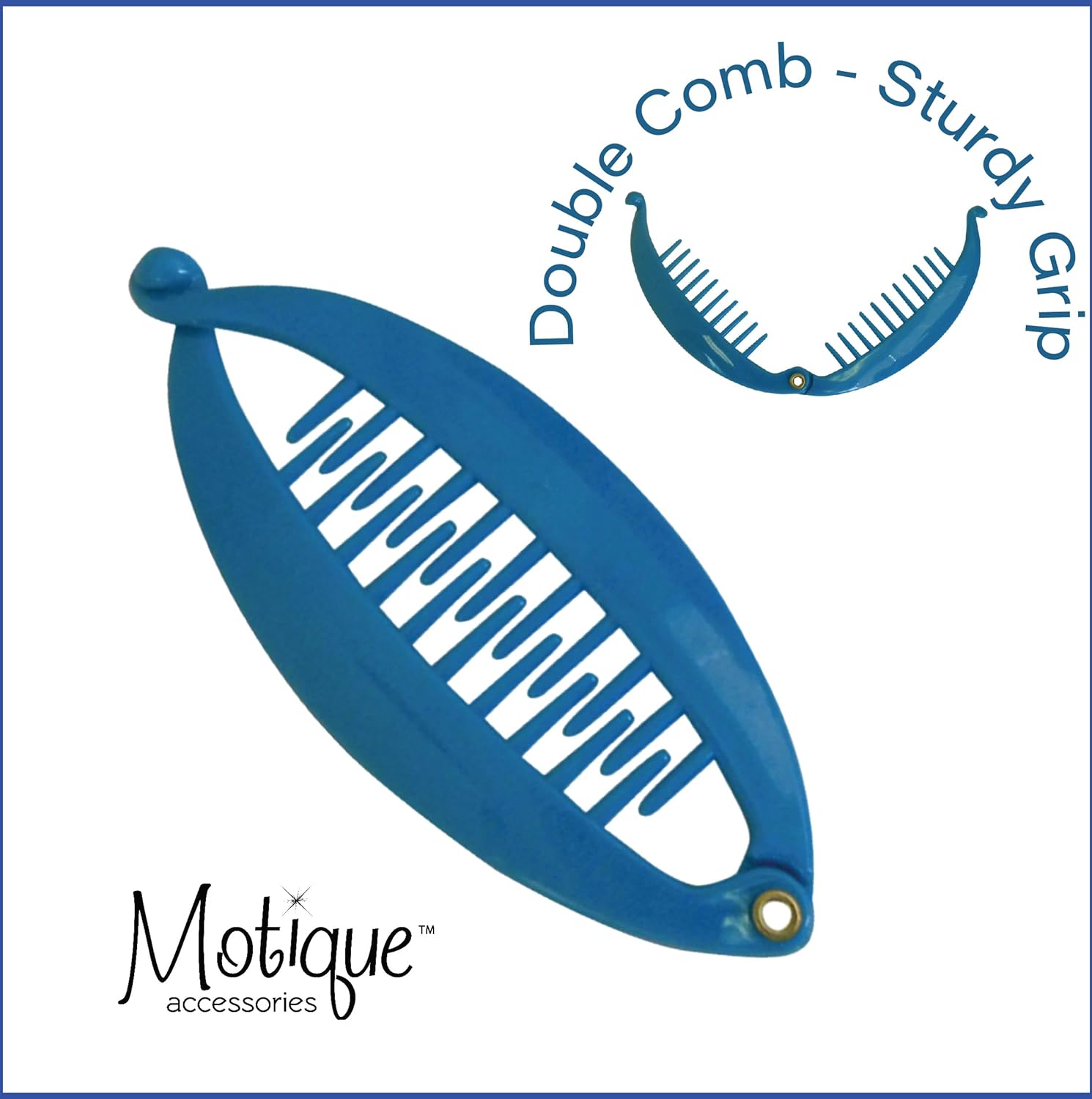 This is a popular women's banana clip or hair comb for girls. It measures 3.5 inches long and 1.5 inches wide at the widest point. It is made of durable plastic and comes in lots of fashionable colors. Look great in this banana comb! A great hair clip for women and girls! Awesome Retro Style Hair Clincher. Motique Accessories Set of Two Blue 3.5 inch Mini Banana Clip Hair Clincher Rounded Edges Hair Comb. One size fits adult Female and Girls of all ages