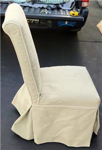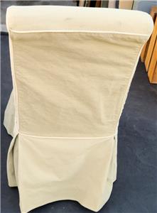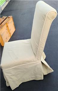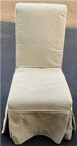 Offered here is this Nice Dining Side Chair. It is fully upholstered and comes with the slipcover as well. The chair is used, and the fabric that it is wrapped in is unfortunately beginning to unravel, particularly around the legs. There are also some light stains on the fabric. I am unsure of the age or origins of the chair. It is sturdy, with a solid wood frame. The chair includes the slipcover that is shown here which is in very good condition and is a great neutral beige color that will go with virtually any décor. The chair is 40” tall at the top of the backrest, 19” high at the seat, 20” wide across the front of the seat, 17.5” wide across the back of the seat, 18” deep at the seat, and 26” deep total. It is a nice, sturdy used chair that would be a great starter piece.